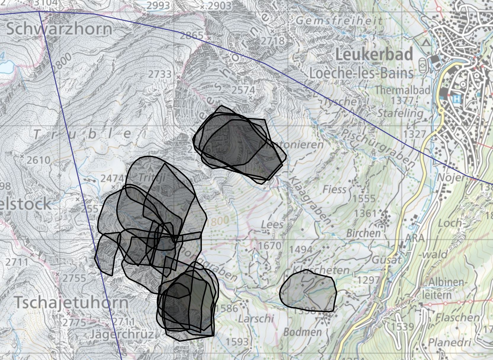 Pendant les précipitations, les nuages et l'obscurité ont rendu difficile, voire impossible, l'observation des avalanches, d'autant plus que celles-ci ne se sont pas descendues jusque dans les vallées. Les seules indications de cette situation assez délicate provenaient des détections automatiques d'avalanches, qui fonctionnent indépendamment des conditions météorologiques et de la luminosité grâce à la technologie radar. Le dimanche 7 décembre, une telle installation a enregistré 19 avalanches au-dessus de Loèche-les-Bains (fig. 2) et 10 près de Zinal (VS). La plupart des avalanches détectées étaient de taille moyenne.