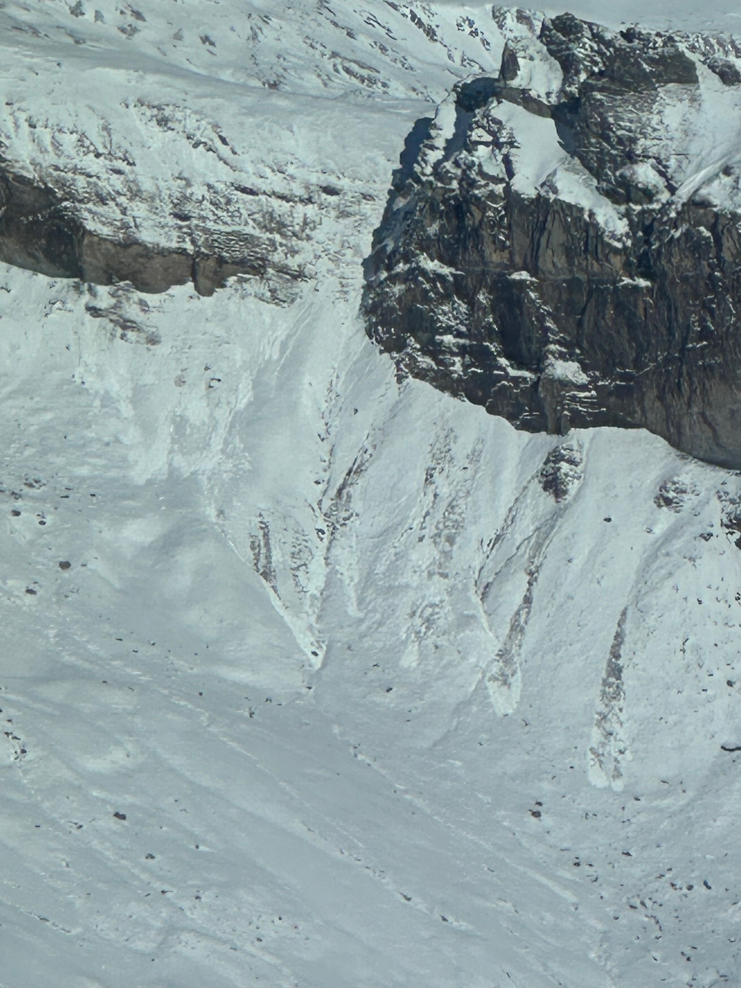Le lundi 8 décembre, le ciel s'est dégagé. On a alors pu constater que de nombreuses avalanches de neige sans cohésion s'étaient déclenchées spontanément avec la pluie (fig. 3) ou au cours de la journée de lundi sous l'effet du rayonnement solaire (fig. 4). De nombreuses avalanches de plaque de neige ont également été observées (fig. 5).