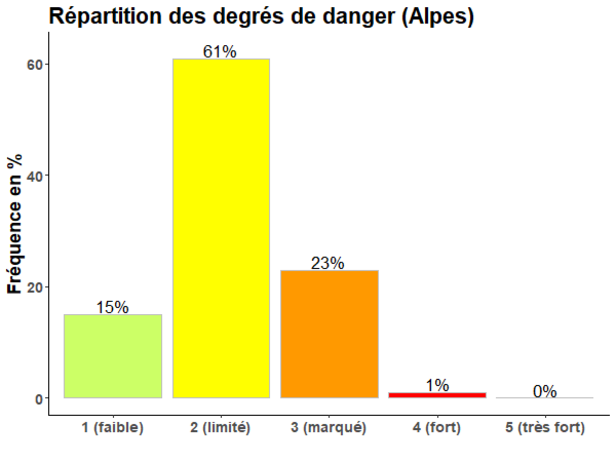 Jusqu’au 14 avril, la répartition des degrés de danger pour l’hiver 2024/25 est la suivante : degré 1 (faible) 15 %, degré 2 (limité) 61 %, degré 3 (marqué) 23 %, degré 4 (fort) 1 % et degré 5 (très fort) 0 % (figure 3). Les périodes de fort danger d’avalanches (degré 4) étaient associées à d’importantes chutes de neige : au début de l’hiver (19-20 novembre 2024) tout à l’ouest, avant Noël (22-24 décembre 2024) à l’ouest et au nord, fin janvier à l’ouest, au sud ainsi que dans les Grisons (27-29 janvier 2025) et mi-mars au sud (14 mars 2025). Fin janvier 2025 a eu lieu la phase de plus grande activité avalancheuse jusqu’à présent et quelques départs d’une taille impressionnante se sont produits dans le sud ainsi que dans les Grisons. Les dégâts matériels sont heureusement restés limités. De février à début mars 2025, la situation avalancheuse était souvent favorable avec un danger généralement faible ou limité (degrés 1 et 2). À partir de la seconde moitié du mois de mars, en raison de l’humidification croissante du manteau neigeux, le danger d’avalanches de neige mouillée et de glissement a augmenté à chaque fois en cours de journée, atteignant généralement le degré 2 (limité).