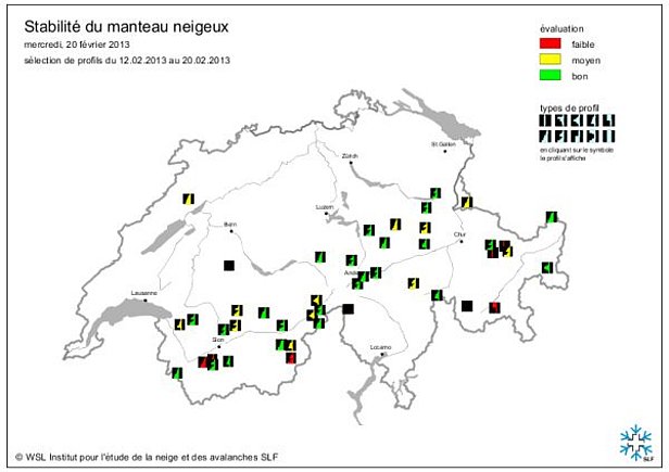 - Du 01.02. au 03.02.2013: De 60 à 80 cm de neige sont tombés au-dessus de 2000 m environ sur le versant nord des Alpes, dans le Bas-Valais et dans le nord du Valais. En raison des précipitations intensives, de nombreuses avalanches se sont déclenchées tout particulièrement dans les régions les plus occidentales du Valais.