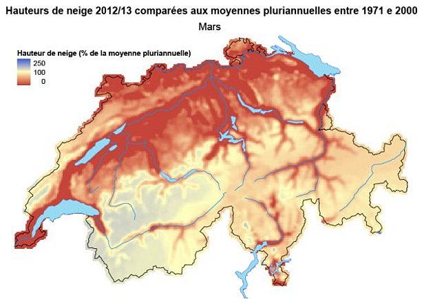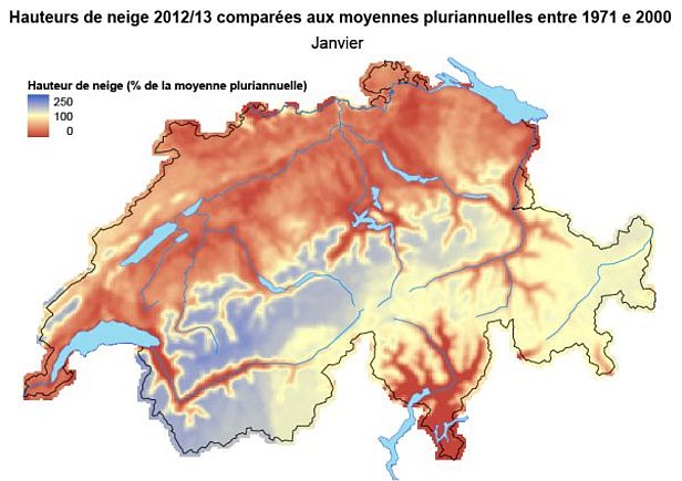 Sur la base de mesures effectuées dans toute la Suisse aux stations de MétéoSuisse, l’hiver dernier (novembre 2012 – mars 2013) était légèrement trop froid. Seul le mois de novembre était plus chaud que la normale. Les quantités de précipitations étaient supérieures à la normale surtout sur le Plateau central, et elles étaient légèrement inférieures aux données moyennes dans les Alpes. En raison des températures relativement froides, les quantités de neige fraîche étaient, elles aussi, supérieures aux valeurs moyennes en de nombreux endroits de la façade nord des Alpes. Sur le Plateau central entre Genève, Bâle, Zurich et St-Gall, elles atteignaient même le double des quantités normales. Dans le Tessin, en Engadine et dans le centre des Grisons, les quantités de neige fraîche étaient en revanche légèrement inférieures à la moyenne. Ce ne sont cependant pas les quantités de neige fraîche qui étaient vraiment inhabituelles, mais au contraire le grand nombre de jours avec de la neige fraîche. Pour de nombreuses stations du Plateau central suisse, il faut remonter l’hiver 1986/87 pour trouver davantage de journées avec de la neige fraîche. En dessous de 1000 m, il a neigé environ un jour sur quatre ou sur six entre décembre et mars, et au-dessus de cette altitude, la fréquence des chutes de neige était même d’un jour sur deux à un jour sur trois. Compte tenu de cette fréquence élevée de chutes de neige, il ne restait plus beaucoup de journées au cours desquelles le soleil pouvait se manifester. Il n’est dès lors pas étonnant qu’au cours de la période examinée, les stations de MétéoSuisse aient enregistré une durée d’ensoleillement nettement plus faible que la normale. Sur une grande partie du Plateau central, les nombreux jours avec de la neige fraîche se sont traduits, à la mi-décembre, par un manteau neigeux d’une épaisseur de 30 à 50 cm, égalant ainsi parfois les hauteurs de neige de décembre 1999 et donnant même lieu dans certains cas à de nouvelles valeurs maximales aux stations de l’ouest situées à une altitude relativement élevée. La période suivante, aux alentours de Noël, était ensuite caractérisée par une météo de fonte de neige si marquée que ce n’est qu’au-dessus de 800 m que la neige a pu persister. Les chutes de neige relativement importantes dans l'ouest ont eu pour conséquence que les hauteurs de neige au-dessus de 1000 m à toutes les stations à l’ouest de la région de Gothard sont restées constamment supérieures aux valeurs moyennes de début décembre à fin mars. En revanche, les hauteurs de neige dans le nord et le centre des Grisons correspondaient seulement aux valeurs moyennes, et en Engadine ainsi que sur le versant sud des Alpes, elles étaient dans la plupart des cas inférieures aux données moyennes.