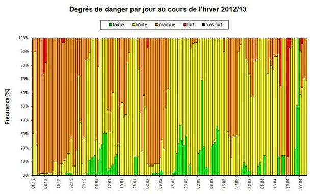 Au cours de l’hiver 2012/13, le danger d’avalanche a été évalué comme suit: (entre parenthèses: moyenne des 15 dernières années, à chaque fois de décembre à avril, cf. figure 2): degré de danger 1 (faible): 6% (16%), degré de danger 2 (limité): 56% (48%), degré de danger 3 (marqué): 37% (34%), degré de danger 4 (fort): 1% (2%), degré de danger 5 (très fort): 0% (0,2%).