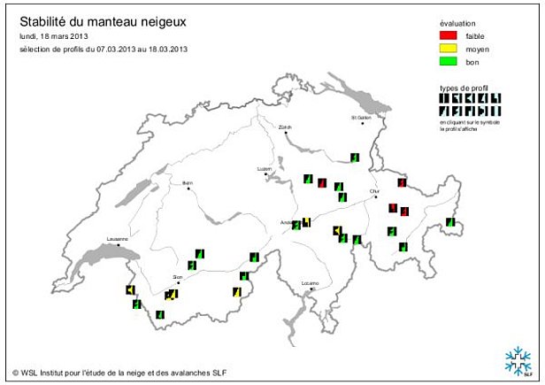 - Du 17.03. au 19.03.2013: De chutes de neige accompagnées de vents tempétueux de secteur sud-ouest ont touché tout d’abord le sud et l'ouest. Lorsque le foehn a cessé de souffler, les précipitations se sont également étendues aux autres régions. Sur l’ouest du versant nord des Alpes, dans la partie la plus occidentale du Bas-Valais ainsi que dans le nord du Valais, sur le versant sud des Alpes et en Haute-Engadine, on enregistrait quelque 50 cm de neige fraîche. De nombreux départs d’avalanches ont été signalés.