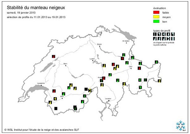 - Du 10.01. au 12.01.2013: Un front froid a apporté de 30 à 50 cm de neige et localement jusqu’à 70 cm sur le versant nord des Alpes et dans certaines parties du Valais. La limite des chutes de neige se situait aux alentours de 800 m. Pendant un certain temps, le risque de décrochement était élevé.