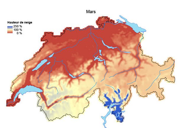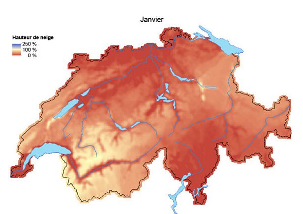 Abstraction faite des chutes de neige de fin novembre dans l’ouest et le nord, l'hiver était particulièrement sec avec peu de neige jusqu’au Nouvel An. La figure 4 montre qu’il a neigé abondamment de janvier jusqu’à début mars, surtout dans certaines régions de l’ouest et du nord. A partir de la mi-avril, on a assisté à un nouveau retour de l’hiver et, avec des chutes de neige à diverses reprises, le temps était souvent plutôt hivernal que printanier dans les Alpes suisses jusqu’en mai.