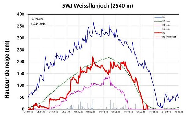 Au cours de l’hiver 2015/16, les hauteurs de neige indiquées dans la figure 5 correspondaient aux valeurs moyennes dans l’ouest des Alpes suisses, mais elles étaient inférieures dans l’est et le sud, et nettement inférieures à ces valeurs dans l’extrême sud.
