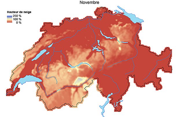 Les trois premières semaines de novembre étaient ensoleillées et extrêmement douces. L’isotherme zéro degré se situait généralement entre 3000 m et 4000 m. En dépit du refroidissement sensible intervenu le 21 novembre, l’excédent thermique à la fin du mois était de 2.6 degrés. Par conséquent, ce mois de novembre était le troisième mois le plus chaud depuis le début des mesures en 1864. Ce n’est qu’en 2015 et en 1994 que novembre était encore plus doux (source: MétéoSuisse). Deux offensives hivernales au cours de la quatrième semaine de novembre ont marqué le début de l’hiver, tout au moins dans le nord et l’ouest. Du 20 au 22 novembre, il est tombé de 80 à 100 cm de neige au-dessus de 2500 m environ dans le nord et l’ouest. Dans le sud, le temps était resté sec. Peu de temps après, du 25 au 26 novembre, il est à nouveau tombé de 40 à 60 cm et localement jusqu’à 90 cm de neige dans le nord. Dans l’extrême sud, il n’y a pas eu de précipitations. Considérées sur l’ensemble du mois, les hauteurs de neige étaient légèrement inférieures aux données moyennes dans le nord et l’ouest. Dans le sud et dans les Grisons, il n’y avait pas de neige à moyenne altitude, et plus haut également, il y avait nettement moins de neige que la normale (cf. figure 7, en haut). Ce n’était que sur les pentes exposées au nord au-dessus de 2400 m environ qu’il y avait un manteau neigeux continu.
