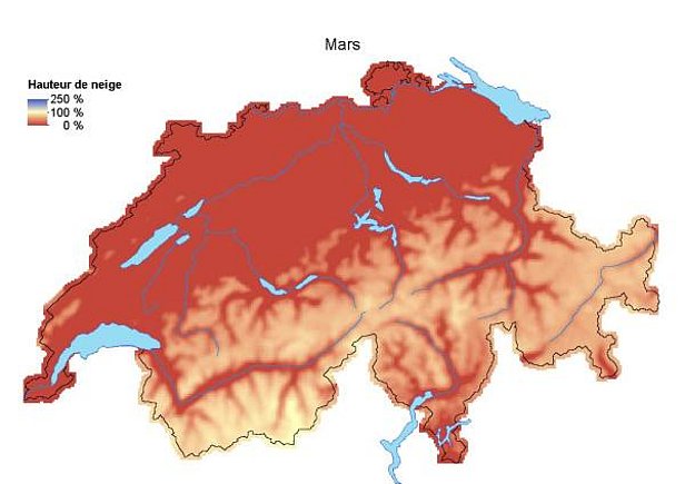 Février a été déjà à nouveau trop chaud, et surtout trop sec dans les régions intra-alpines. Au cours des deux premières semaines de février, on a constaté des précipitations répétées. Il a neigé brièvement jusqu’à basse altitude, mais il également souvent plu jusqu’au-dessus de 2000 m. Les chutes de neige, qui ont pu atteindre 80 cm, ont été les plus abondantes à haute altitude au sud et à l’ouest. Dans la deuxième moitié de février, il a neigé également un peu au nord à haute altitude. Sur l’ensemble de février, les hauteurs de neige étaient toujours sous la moyenne, et fortement sous la moyenne dans le sud. En comparaison avec la normale (figure 9, en bas), la plupart des stations de mesure manuelles rapportaient des hauteurs de neige d’à peine 30 à 60 % de celles qu’on attend en général à cette époque de l’année. Mais la plupart des stations n’enregistraient pas de minimum absolu de hauteur de neige pour ce moment de l’année. À la fin février, on observait à 2000 m dans le Tessin de 50 à 80 cm, sur la crête principale valaisanne des Alpes et dans le sud des Grisons seulement 20 à 50 cm, au nord et dans la région du Gothard 80 à 120 cm de neige. Le Jura et le Sottoceneri étaient largement exempts de neige, uniquement les plus hauts sommets étaient encore enneigés.