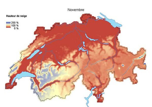 Novembre a été d’abord froid et hivernal, et ensuite doux comme en fin d’été, avec pour finir une moyenne un peu inférieure à la normale. Après deux incursions hivernales avec des chutes de neige abondantes dans la première moitié du mois de novembre au nord et à l’ouest, on y observait généralement à moyenne altitude un manteau neigeux continu, comme dans le Jura. Dans la deuxième moitié de novembre, une situation de blocage de sud persistante a amené des précipitations abondantes sur le versant sud des Alpes, avec jusqu’à 200 cm de neige au-dessus d’environ 2400 m dans le nord du Tessin et dans la région du Simplon. Le manteau neigeux qui s’est alors formé n’a été que de courte durée, car les journées de foehn qui ont suivi ont fait fondre la neige jusqu’à très haut. À la fin novembre on trouvait à 2500 m dans le nord du Valais et sur la crête principale des Alpes valaisannes, ainsi que sur le versant sud des Alpes sauf dans la vallée de Münster de 50 à 100 cm de neige, et jusqu’à 180 cm dans la région du Simplon. Ailleurs, la couche était généralement de 20 à 50 cm. Sur l’ensemble de novembre, les hauteurs de neige à l’ouest et dans le Valais ont été dans la moyenne, voire un peu au-dessus, sinon en général sous la moyenne (figure 7, en haut).