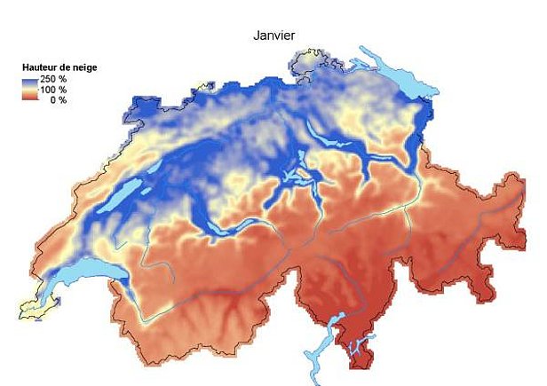 L’enneigement extrêmement tardif, et la fonte précoce ont impliqué pour quelques stations une durée extrêmement courte de la couverture neigeuse. C’est le cas par exemple à Ulrichen (VS, 1350 m) dans le Goms supérieur, où une couverture continue n’a subsisté que pendant 86 jours, ce qui représente 56 % de la normale (156 jours). L’hiver passé fait partie dans toute la Suisse du plus faiblement enneigé et du plus court depuis le début des mesures. Les hauteurs de neige presque normales dans quelques vallées au pied des Préalpes constituent une exception (par exemple région de Thoune, Schwyz ou plaine de la Linth), et découlent uniquement du mois de janvier bien enneigé dans ces régions.