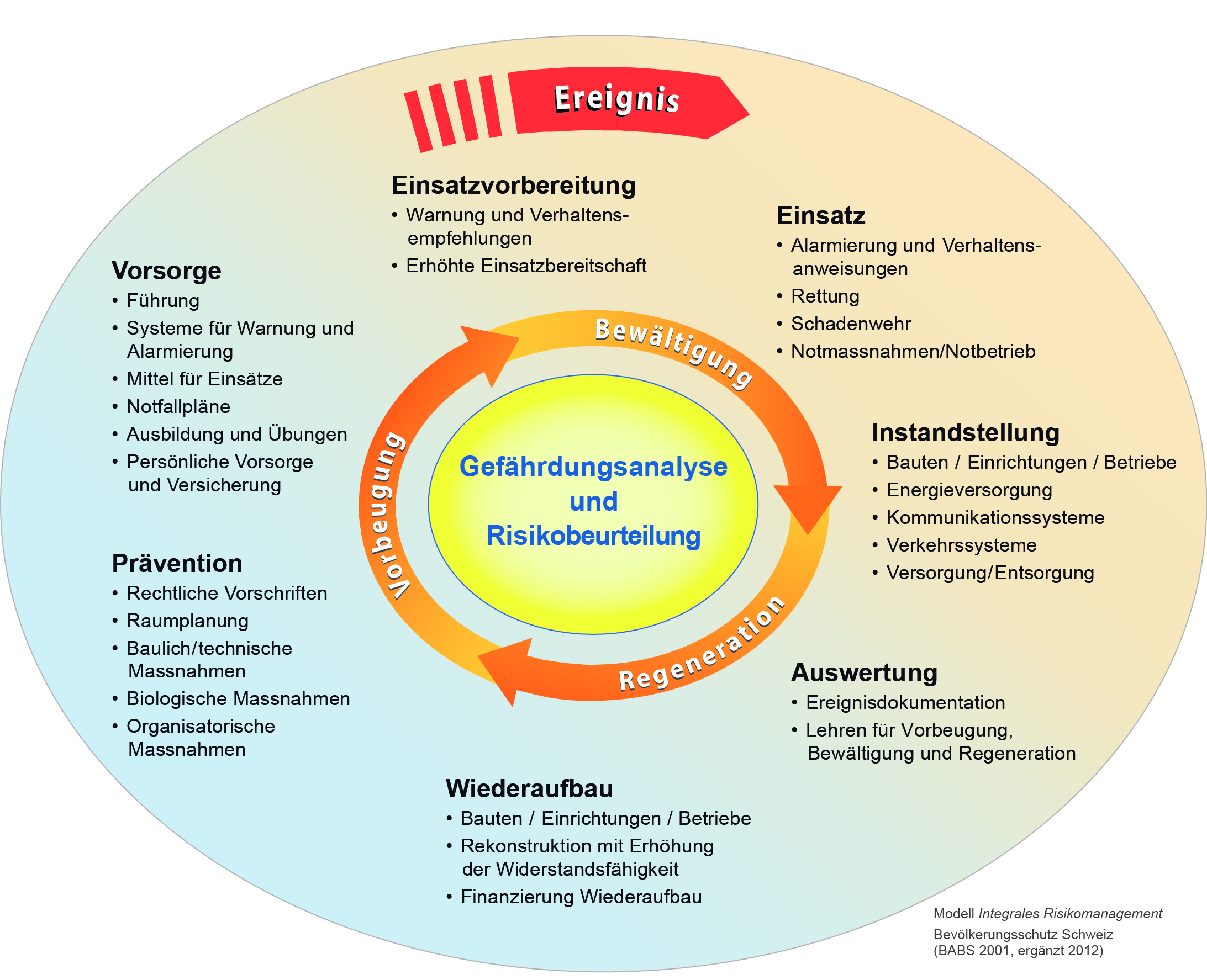 Les dégâts que causent les crues, les laves torrentielles, les glissements de terrain, les éboulements, les avalanches, les tempêtes et les séismes ne peuvent être complètement évités, et ce, malgré les lourds investissements consentis dans des mesures de protection. La sécurité absolue n'est pas possible. Avec une gestion des risques largement étayée, nous pouvons néanmoins tenter de prévenir les dommages ou de les minimiser autant que possible.