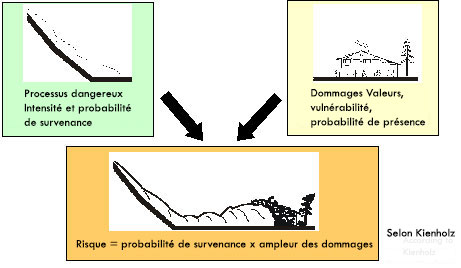 Une avalanche à elle seule n'est pas synonyme de risque. Celui-ci n'entre en jeu que s'il s'accompagne d'un processus dangereux éventuel, comme lorsqu'une avalanche est susceptible de causer des dommages en ensevelissant un skieur ou un bâtiment, p. ex. Dans le langage technique, le terme de risque est ainsi désigné comme la probabilité que des dommages d'un montant déterminé surviennent sur une période donnée (CHF 100'000 sur un an, p. ex.), ce qui correspond à la formule simple: risque = probabilité de survenance x ampleur des dommages.