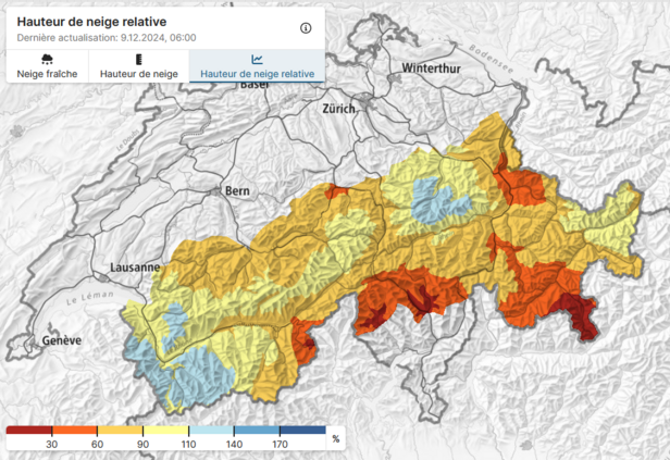 Avec les précipitations de décembre, le manque de neige s'est quelque peu atténué par rapport au mois de novembre. Dans l'ouest et à haute altitude du versant nord des Alpes, les hauteurs de neige correspondaient le lundi 9 décembre aux valeurs habituelles à cette date de référence (cf. figure 6). Le déficit de neige le plus important se situe toujours dans la région du Simplon, dans le nord du Tessin, en Haute-Engadine et dans la vallée de Poschiavo, où les hauteurs de neige relevées par la plupart des stations IMIS sont actuellement proches des valeurs minimales pour la saison, c'est-à-dire d'environ 10 à 50 cm à environ 2400 m (cf. figure 6).