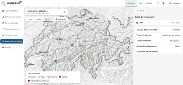 Des informations sur les avalanches déclenchées sont disponibles sur Whiterisk (cf. figure 8). Toutes les avalanches signalées sont représentées pendant au maximum trois jours. En cliquant sur les points de données, des informations supplémentaires sont affichées. Dans les paramètres, il est possible de filtrer les avalanches en fonction des critères choisis. Dans certains cas, une seule avalanche peut être signalée à plusieurs reprises (surtout en cas d'accident d'avalanche). Une correction intervient généralement quelques jours après le signalement.