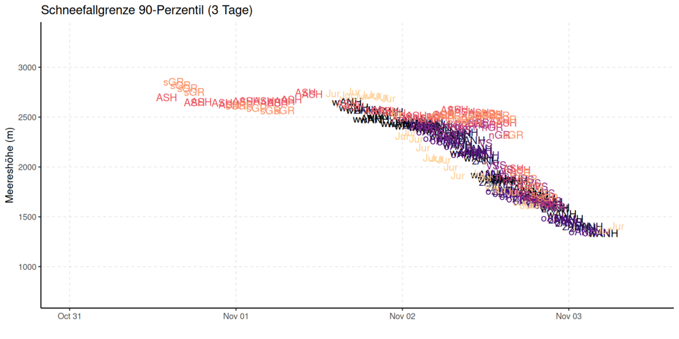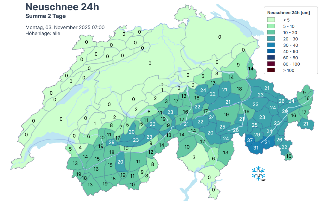 Entre le samedi soir 1er novembre et la fin des précipitations le lundi matin 3 novembre, les quantités suivantes de neige sont tombées dans le nord au-dessus de 2500 m environ et dans le sud au-dessus de 2800 m environ (cf. figure 3) :