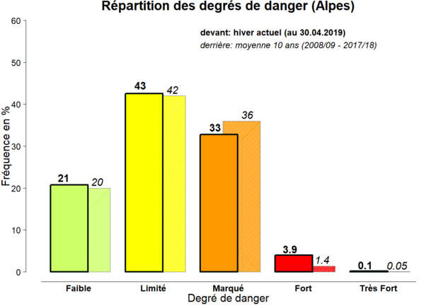 Pendant l’hiver 2018/19, les degrés de danger élevés (4 et 5) ont été utilisés plus fréquemment qu’en moyenne pluriannuelle. Le degré 4 (fort) a été pratiquement prévu 3 fois plus souvent (3,9 %) qu’en moyenne des dix dernières années (1,4 %). Le degré 5 (très fort) a été prévu pour une journée. Depuis l’hiver avalancheux 1999, ce fut le deuxième hiver consécutif avec un danger d’avalanches très fort sur des régions étendues. Le degré de danger 3 (marqué) a été un peu moins fréquemment prévu (33 %) qu’en moyenne pluriannuelle (36 %). La fréquence des situations avec des degrés de danger faible resp. limité (1 et 2) a correspondu (avec 21 % resp. 43 %) à peu près à la moyenne (20 % resp. 42 %).