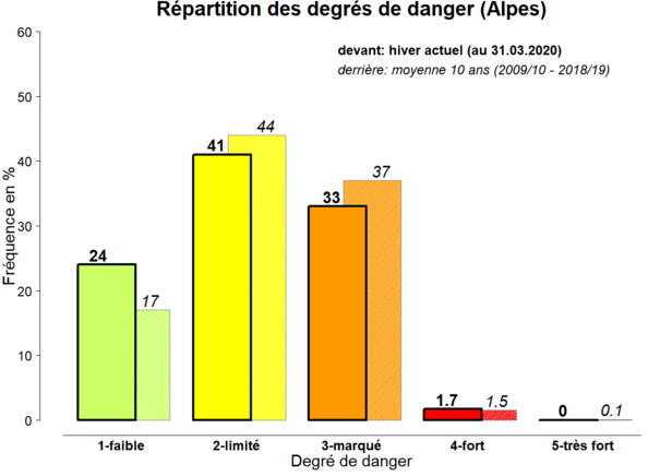 Au début du mois de mars, il a neigé à plusieurs reprises et parfois de façon abondante. Ces chutes de neige ont été accompagnées de vents tempétueux. Mais à la fin de la période de précipitations, la pluie est remontée jusqu’à environ 2400 m. Il en a résulté plusieurs épisodes avalancheux, avec des avalanches généralement sèches, puis de nombreuses avalanches mouillées en fin de période. Le 11 mars a enregistré la plus forte activité avalancheuse de l’hiver avec une forte proportion d’avalanches de neige mouillée. Après cela, le mois de mars a été très ensoleillé et doux.