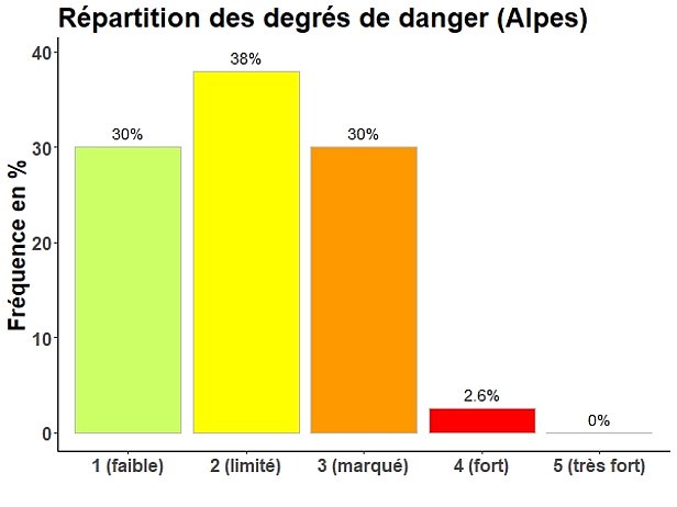 Jusqu’au 11 avril, la répartition des degrés de danger pour l’hiver 2021/2022 est la suivante: degré 1 (faible) 30 %, degré 2 (modéré) 38 %, degré 3 (marqué) 30 %, degré 4 (fort) 2,6 %, et degré 5 (très fort) 0 % (figure 1). Des périodes de fort danger d’avalanches persistant et étendu (degré 4) ont eu lieu du 9 au 11 décembre et du 29 au 30 décembre 2021, du 1er au 3 février et du 8 au 9 avril 2022. De plus, le danger d’avalanches a été fort (degré 4) dans certaines régions pour des journées isolées les 30 novembre 2021, 4 décembre 2021, 7 et 22 février 2022. Les situations avalancheuses les plus critiques se sont concentrées en décembre et en février. C’est au cours de ce dernier mois que se sont produits, et de loin, les accidents d’avalanche les plus nombreux impliquant des personnes. En revanche, il y a aussi des phases où les conditions ont été particulièrement favorables avec un faible danger d’avalanches de neige sèche (degré 1) persistant et généralisé en janvier et en mars.
