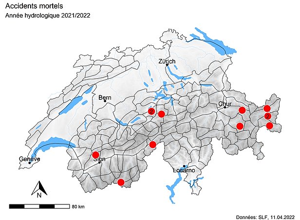 Jusqu’au 11 avril, 12 personnes sont mortes dans des avalanches. Le nombre de victimes est également inférieur à la moyenne sur 20 ans de 18 morts jusqu’au 11 avril. Il s’agissait uniquement d’amateurs de sports d’hiver qui se trouvaient en terrain non sécurisé: sept personnes effectuaient une randonnée, et cinq du ski hors-piste. Deux accidents ont coûté la vie à deux personnes à chaque fois, et une personne dans les autres cas.