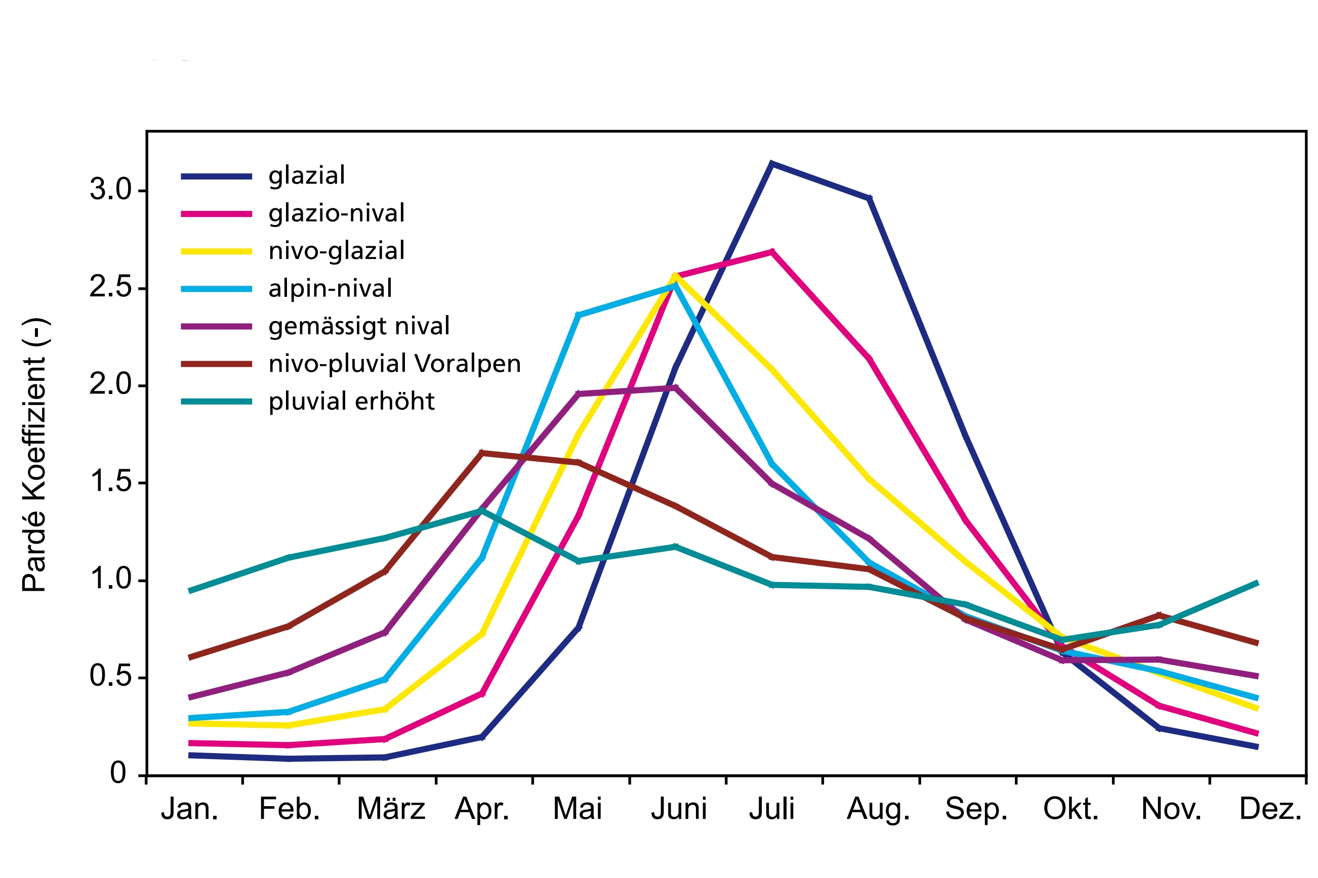 a fonction de stockage intermédiaire est fondamentale. Dans les bassins versants dont le régime est nivologique, les débits les plus importants sont observés en mai et en juin, souvent le double de la moyenne annuelle. Dans les bassins versants glaciaires, les différences saisonnières sont encore plus importantes, alors que les variations de débit des bassins moins élevés sont plus équilibrée