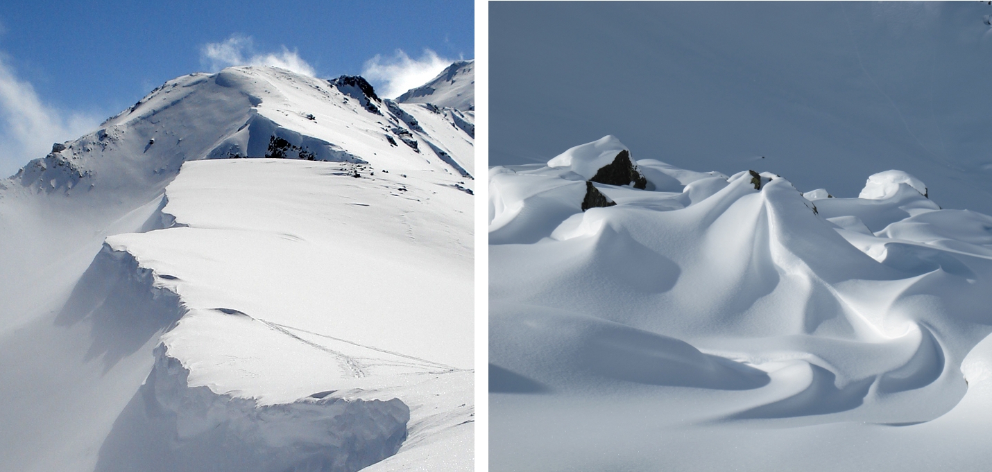 Le vent travaille également la surface de la neige (fig. 1). Il transporte les grains de neige et les use par frottement, forme des croûtes dures, souffle la neige depuis les bosses et les crêtes, remplit les combes et les ravins et peut ainsi rendre les voies de communication impraticables.
