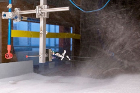 Nous analysons dans deux souffleries le transport et la sédimentation de la neige dans des conditions contrôlées. Nous observons et mesurons entre autres la vitesse, la hauteur, la trajectoire et la distance de vol des différentes particules (fig. 2). La formation des plaques à vent sur le manteau neigeux est également étudiée en soufflerie. Dans un autre projet, nous nous penchons sur la dynamique de la neige soufflée ainsi que sur ses interactions avec l’écoulement turbulent, car jusqu’ici, la réaction de la neige à des forces de vent irrégulières est encore largement méconnue.