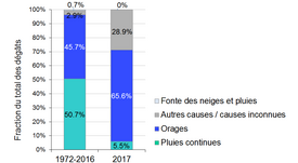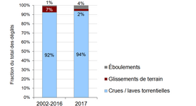 En 2017, les phénomènes naturels ont fait huit victimes et causé environ 170 millions de francs de dommages. Il s’agit du montant le plus important depuis 2007 (700 millions de francs), mais toujours nettement moins que la moyenne de 307 millions de francs constants pour les années 1972 à 2016. Environ 94 % des dommages estimés découlent d’inondations ou de laves torrentielles, alors que les glissements de terrain ont contribué à hauteur de 2 % et les éboulements à pratiquement 4 %. La plupart des dommages ont été provoqués par des orages et autres fortes précipitations (environ 66 %), 5 % découlent de pluies persistantes et environ 29 % étaient dus à d’autres facteurs ou à des raisons inconnues.