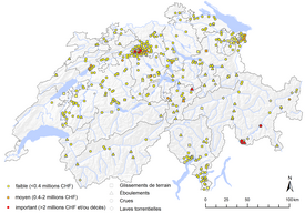 L’Institut fédéral de recherches WSL collecte systématiquement depuis 1972 les informations sur les dommages liés aux intempéries. La banque de données créée avec le soutien substantiel de l’Office fédéral de l’environnement OFEV contient des informations sur les dommages provoqués par les crues, les coulées de boue, les glissements de terrain ainsi que, depuis 2002, les éboulements et chutes de pierres. Les dommages provoqués par les avalanches, le poids de la neige, les séismes, la foudre, la grêle et les tempêtes ne sont pas pris en compte dans les évaluations. L’évaluation des dommages aux biens, aux infrastructures, aux forêts et à l’agriculture se base principalement sur ce que rapportent les médias. Les données sont à disposition des spécialistes, sur demande, et constituent une base essentielle pour l’évaluation des dangers.