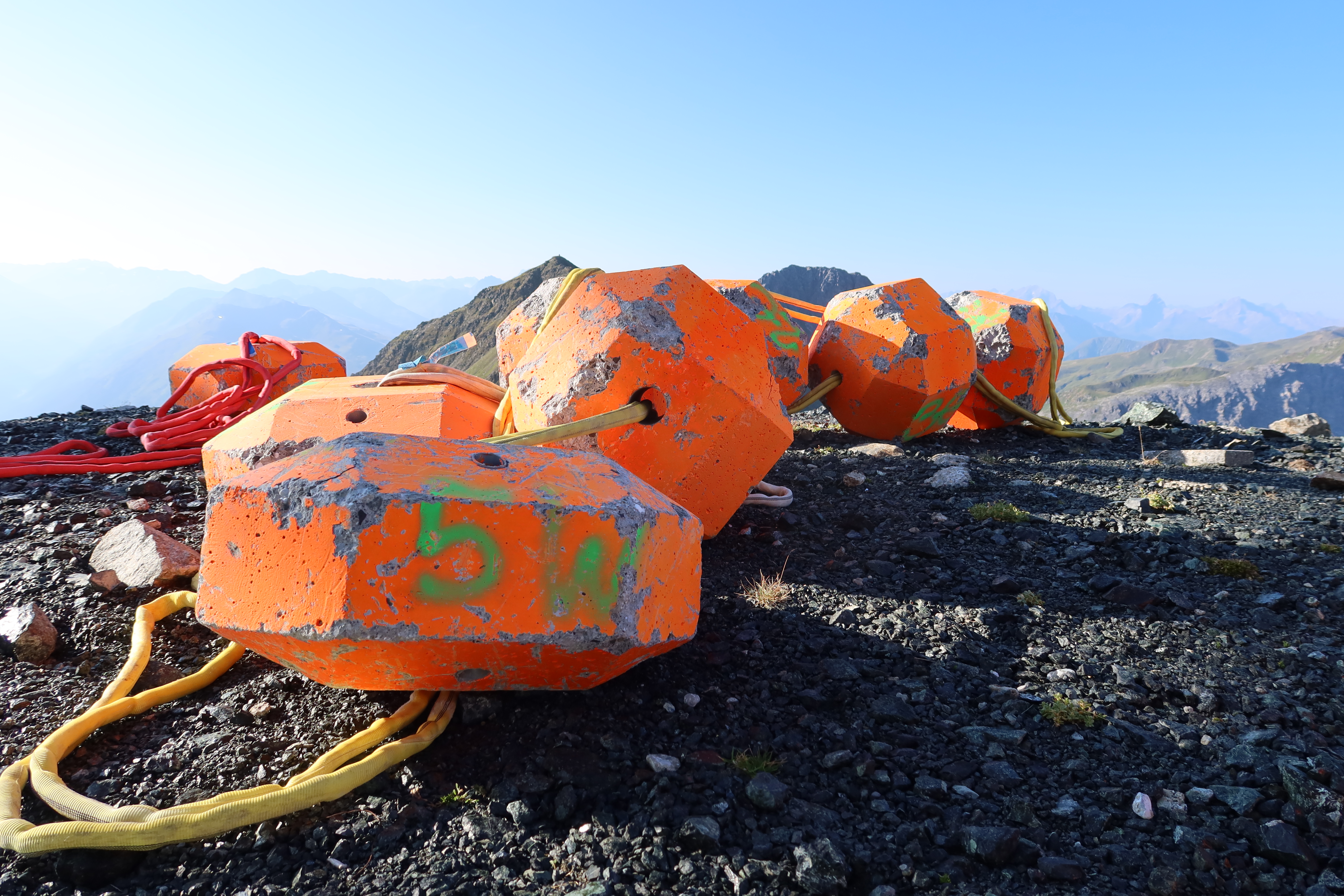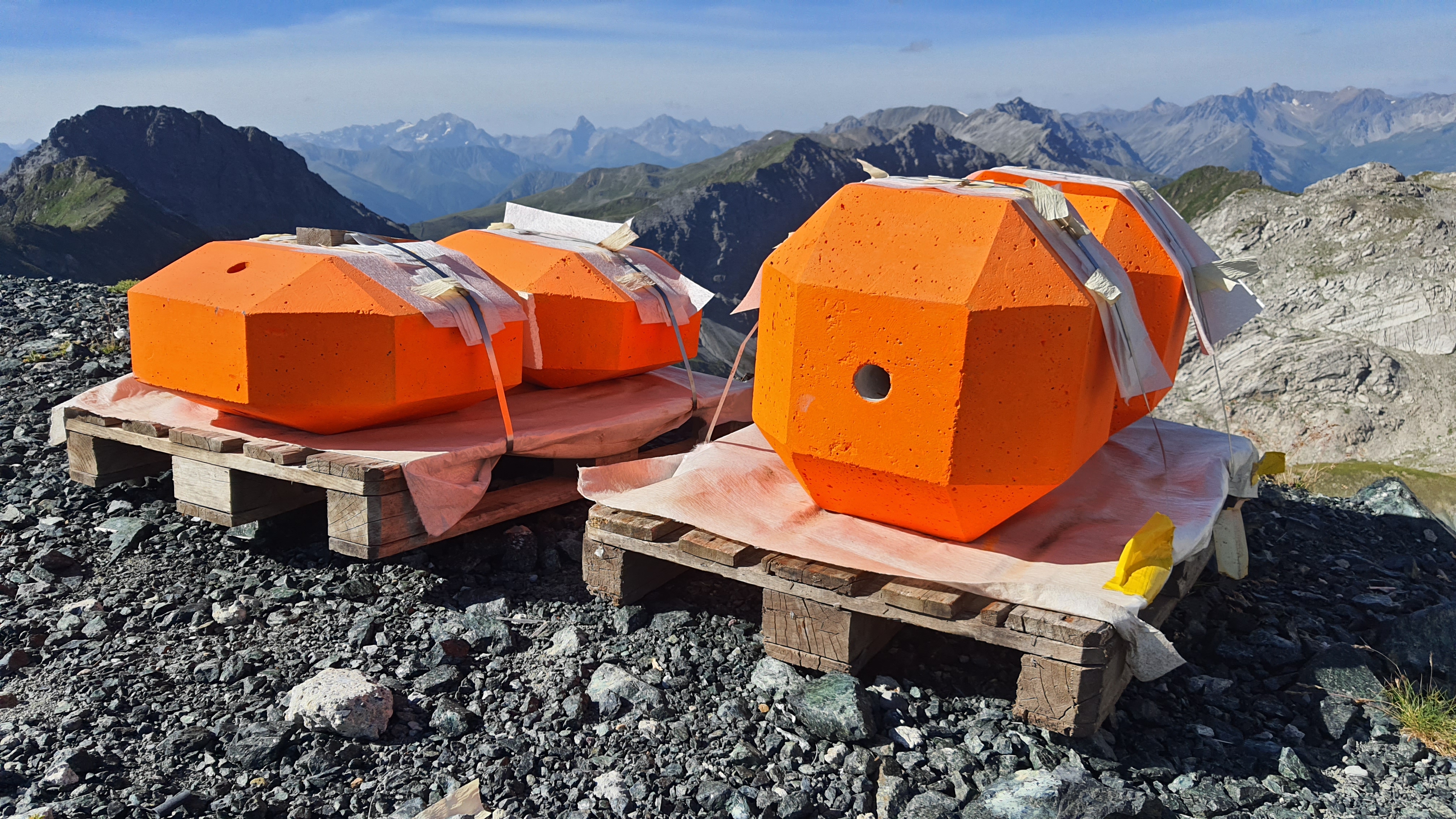 «Oh, oh, il est cassé», dit Joël Borner en regardant son bloc de roche descendre dans le Hauptertälli. L'expert en chutes de pierres du SLF a fait descendre un gros bloc de béton rouge-orange sur une pente d'une bonne trentaine de degrés depuis son lieu de largage près du Weissfluhjoch près de Davos, sur commande : «Nous démarrons dans trois, deux, un, démarre.» Au cours de sa descente, le bloc a heurté un rocher - et s'est brisé en deux dans un grand fracas.