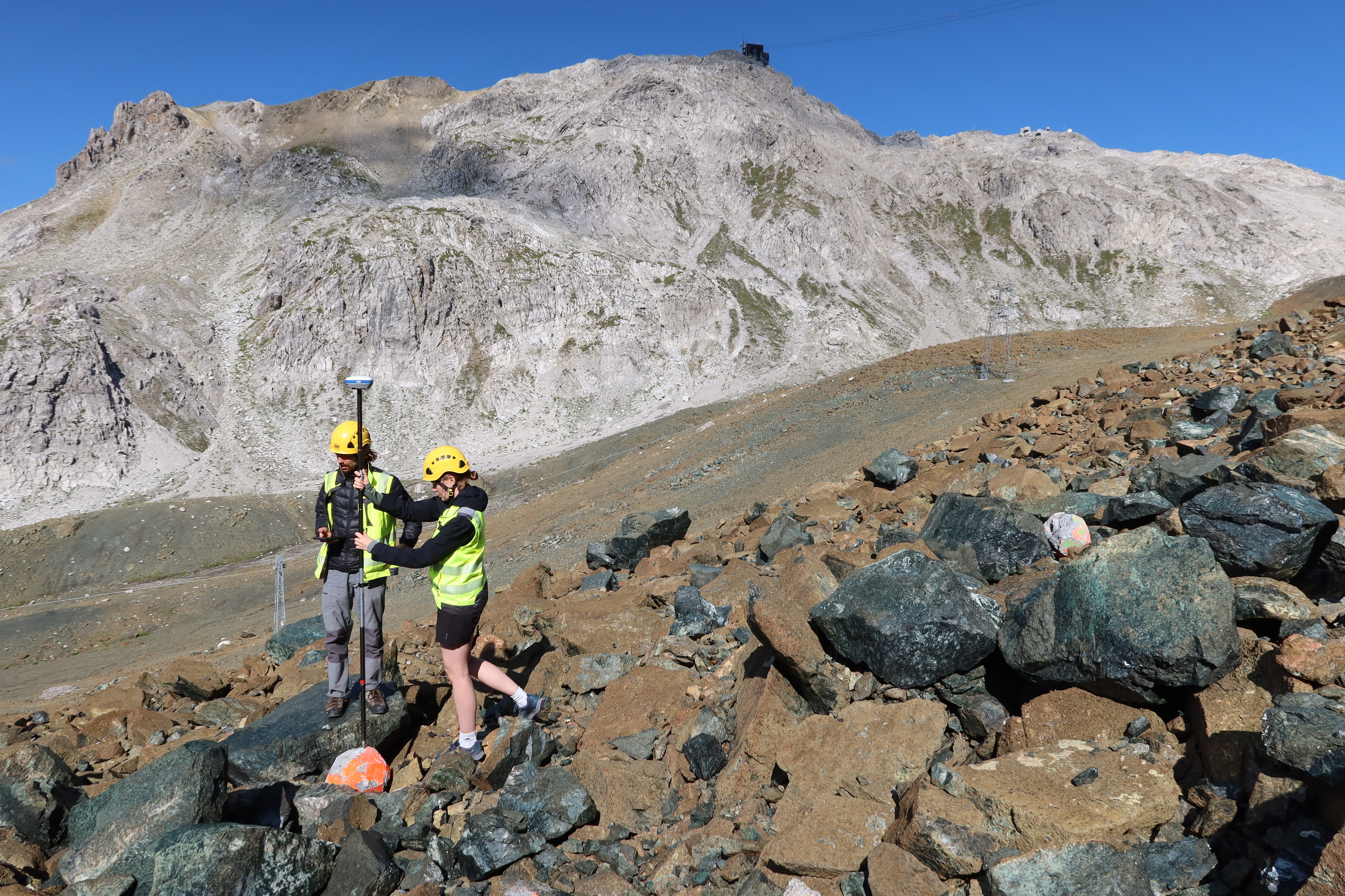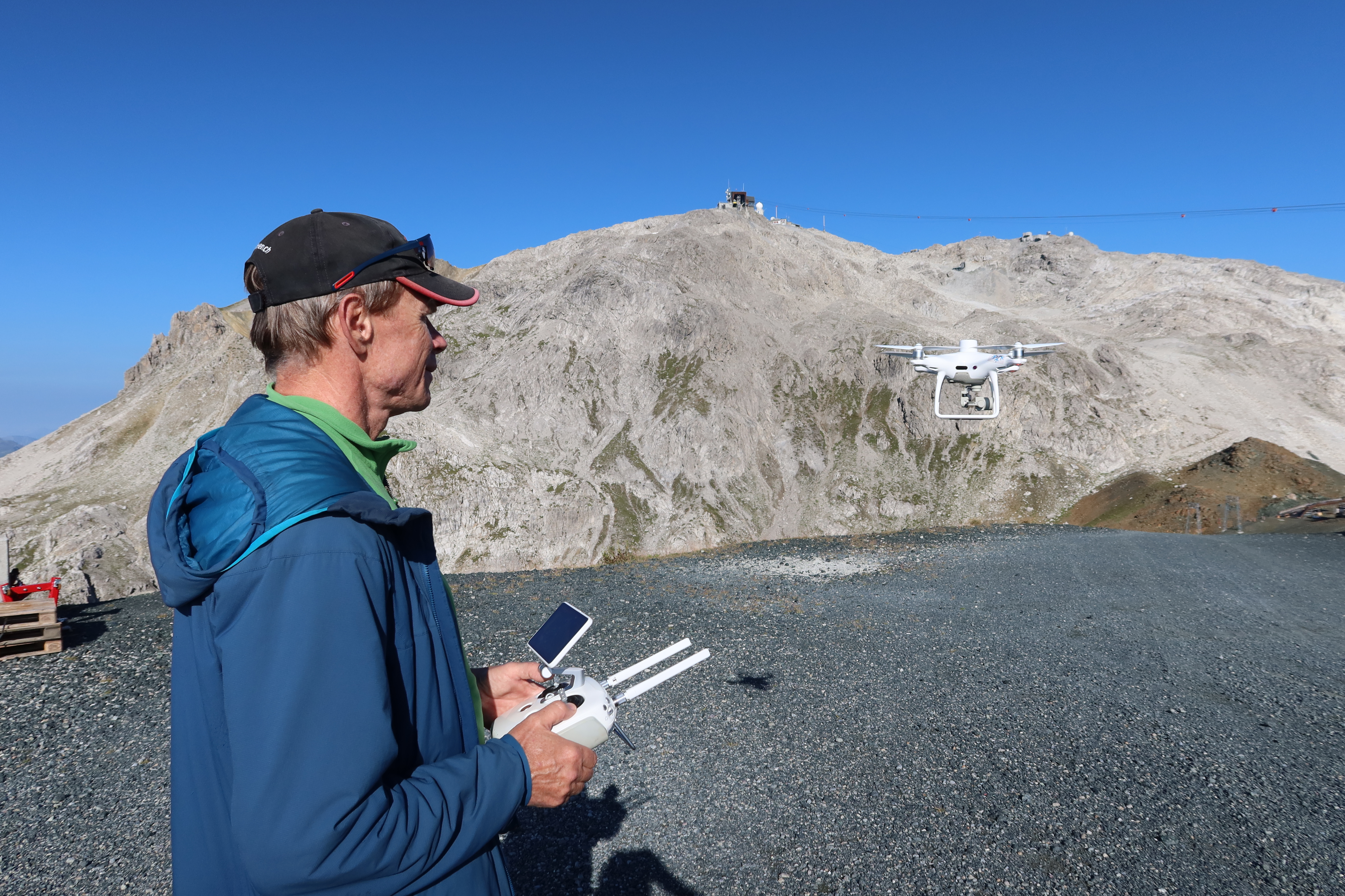 De temps en temps, une pause se produit lors des tests. Le chemin de randonnée est alors dégagé et Andi Stoffel, spécialiste de la télédétection au SLF, mesure le terrain où se trouvent les pierres à l'aide d'un drone. D'en haut, on dirait que quelqu'un a fait une partie de pétanque sur la pente, avec des boules, il est vrai, assez grosses.