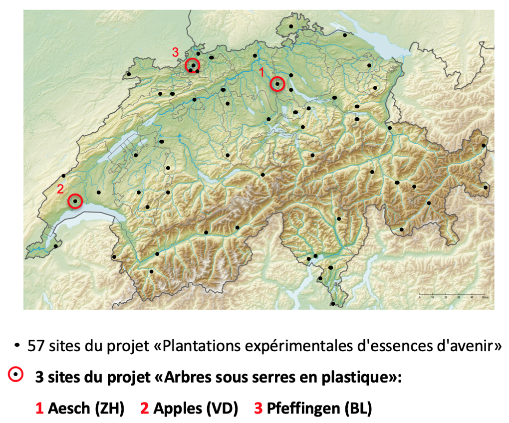 Pour déterminer l'impact sur la compétitivité des essences et le rôle des conditions stationnelles, des semis de six essences d'avenir vont être cultivés sur trois sites dans des serres en plastique, où leur croissance ainsi que les propriétés et la biodiversité du sol seront suivies. En vue de permettre un choix judicieux des essences d'avenir, nous répondrons aux questions suivantes :
