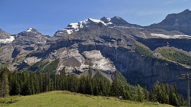 CoopérationThe rock slope instability "Spitze Stei" constitutes a risk for the touristic infrastructure around lake Öschinensee and the village Kandersteg. Our project task will investigate the mechanisms which led to the slope destabilisation and analyse scenarios for slope failures. We want to apply a thermo-mechanical model, which is fed with the rock-mechanical properties, meteorological forcing and the detailed rock kinematics of the instability. Laboratory experiments will be carried out to define strength and friction parameters of the rock under different degrees of water saturation. The kinematical model is established based on geodetical measurements and geomorphologic observations. Key Questions are: Did the observed permafrost thaw trigger the destabilisation of the slope? Can we reproduce the seasonal deformation signal of the last years? How will the instability react to extreme precipitation events? How critical is the current situation? What are realistic failure scenarios?