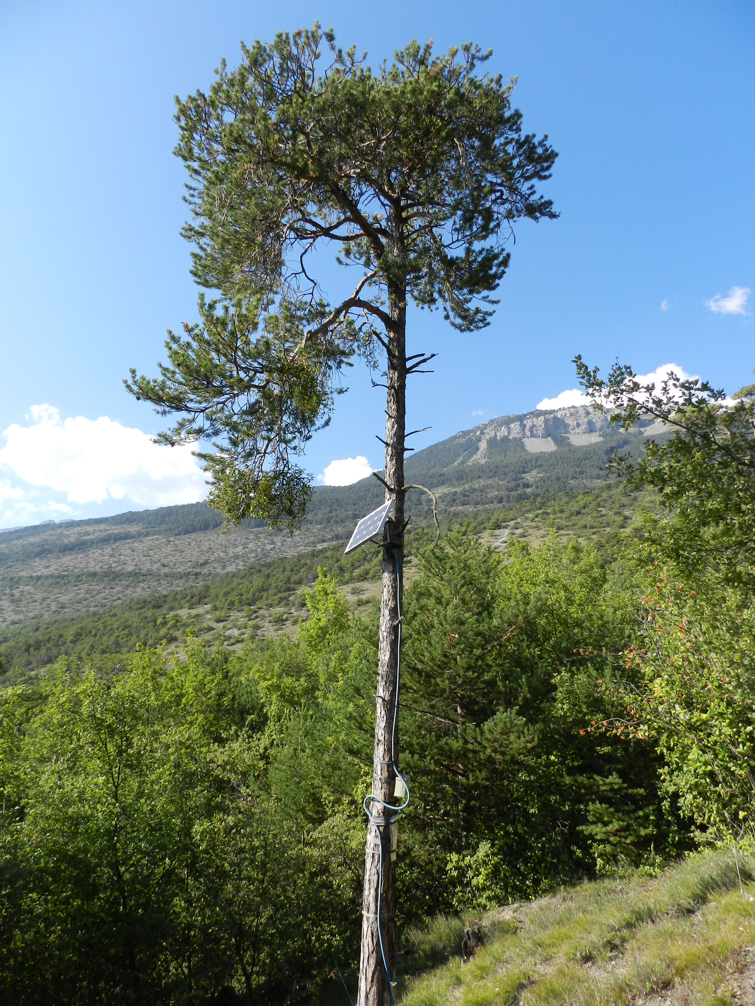 The actual experimental design consists of six circular plots, 5 m in diameter and centred on one dominant Pinus sylvestris tree, with the woody understory vegetation removed at the start of experiment and resprouting being eliminated systematically. Six other plots are left as control. The climate is being monitored by means of nearby meteorological stations of Agroscope, soil sensors are measuring temperature and water content at three depths (online data access) and other sensors are monitoring the tree growth and stem ecophysiology of dominant pines. Responses in the tree crown, soil compartment and herbaceosus vegetation are assessed during repeated measurement campaigns.