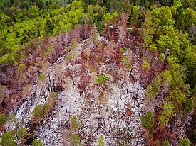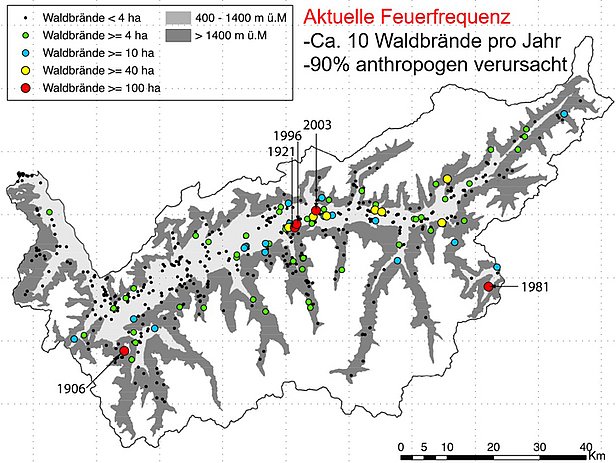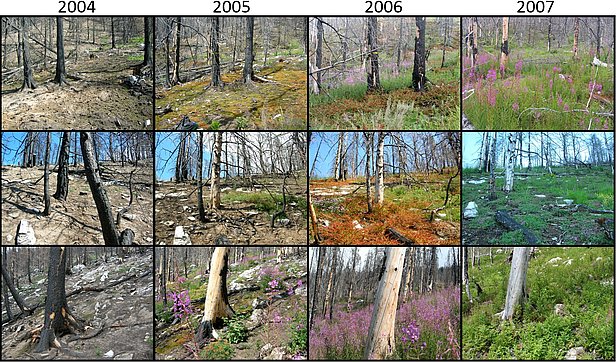 Les incendies de forêt de Loèche (2003, surface brûlée 300 ha, 900-2100 m d'altitude) et de Viège (2011, 130 ha, 700-1600 m d'altitude) font partie des plus grands incendies catastrophiques au nord des Alpes suisses depuis 1900. L'impact socio-économique de ces incendies de forêt - 4 millions de francs rien qu'à Loèche - a non seulement conduit à une nouvelle stratégie en matière d'incendies de forêt en Valais (Gerold 2019), mais aussi à une recherche continue sur mandat du canton, notamment dans le domaine de la régénération et de la biodiversité. Le WSL a observé la dynamique de la végétation après les incendies à Loèche (2004-2007 et 2013) et à Viège (2013, 2018), ainsi que la (re)colonisation par les arthropodes (Loèche ; 2005, 2006, 2008 et 2013), et a publié les résultats de la succession précoce de la forêt dans plusieurs revues scientifiques et spécialisées (par ex, Moser, Gimmi & Wohlgemuth 2006 ; Wohlgemuth et al. 2008a ; Moretti et al. 2010 ; Moser et al. 2010 ; Wohlgemuth et al. 2010a ; Wohlgemuth et al. 2010b ; Wohlgemuth et al. 2012 ; Nussbaumer & Wohlgemuth 2016 ; Moretti et al. 2018 ; Wohlgemuth et al. 2018 ; Wohlgemuth & Moser 2018). L'héritage de l'incendie de Loèche a aidé les autorités forestières à réagir rapidement lors du prochain grand incendie de forêt à Viège (2011) et a favorisé notre compréhension de la capacité de résistance de la forêt après un incendie (Wohlgemuth et al. 2015).