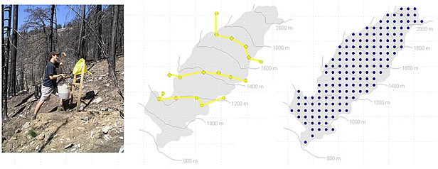 Les études répétées de la végétation seront réalisées sur la grille d'échantillonnage systématique de 125 m x 125 m déjà mise en place à l'intérieur des zones brûlées. La régénération des essences sera étudiée sur 50 m2 à Loèche (n = 150) et à Viège (n = 45). La diversité des espèces de toutes les plantes vasculaires est recensée sur des parcelles de 200 m2 dans la zone brûlée de Loèche (Wohlgemuth et al. 2010a).
