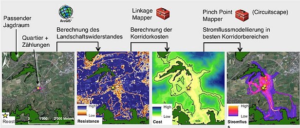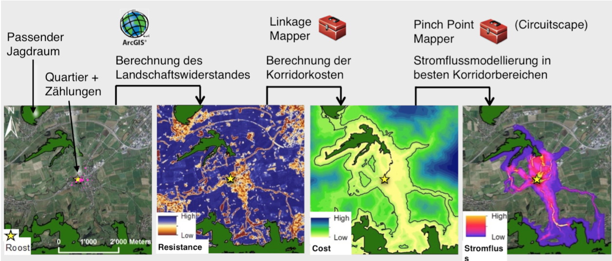 FinancementIn vier Modulen sollten Fledermaus-Flugkorridormodelle optimiert und validiert, für Prioritäre Fledermauskolonien schweizweit berechnet und schliesslich in ausgewählten Gemeinden deren Schutz umgesetzt werden. Ausserdem wird versucht, geeignete Jagdwälder von Grossen Mausohrfledermäusen zu modellieren.