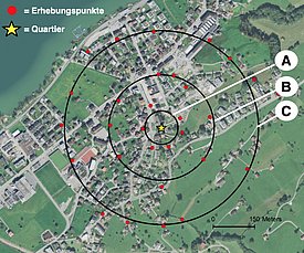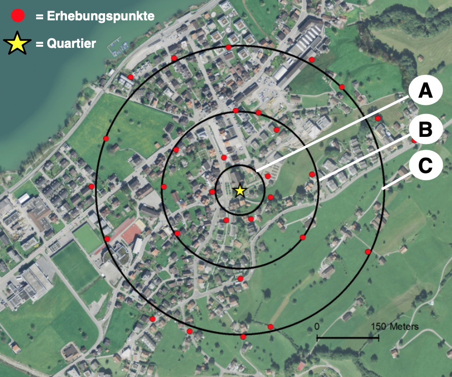 In diesem Modul wurden 2016 durch Thomas Ravessoud (Masterarbeit) und 2019 durch Tina Meier (Masterarbeit) die akustische Aktivität von Grossen Mausohren (Myotis myotis) und Kleinen Hufeisennasen (Rhinolophus hipposideros) um verschiedene Wochenstuben an unterschiedlichen Stellen im Raum um die Quartiere erhoben. Die Aufnahmepunkte wurden dabei in drei verschiedenen Radien (A, B, C) um das Quartier verteilt.
