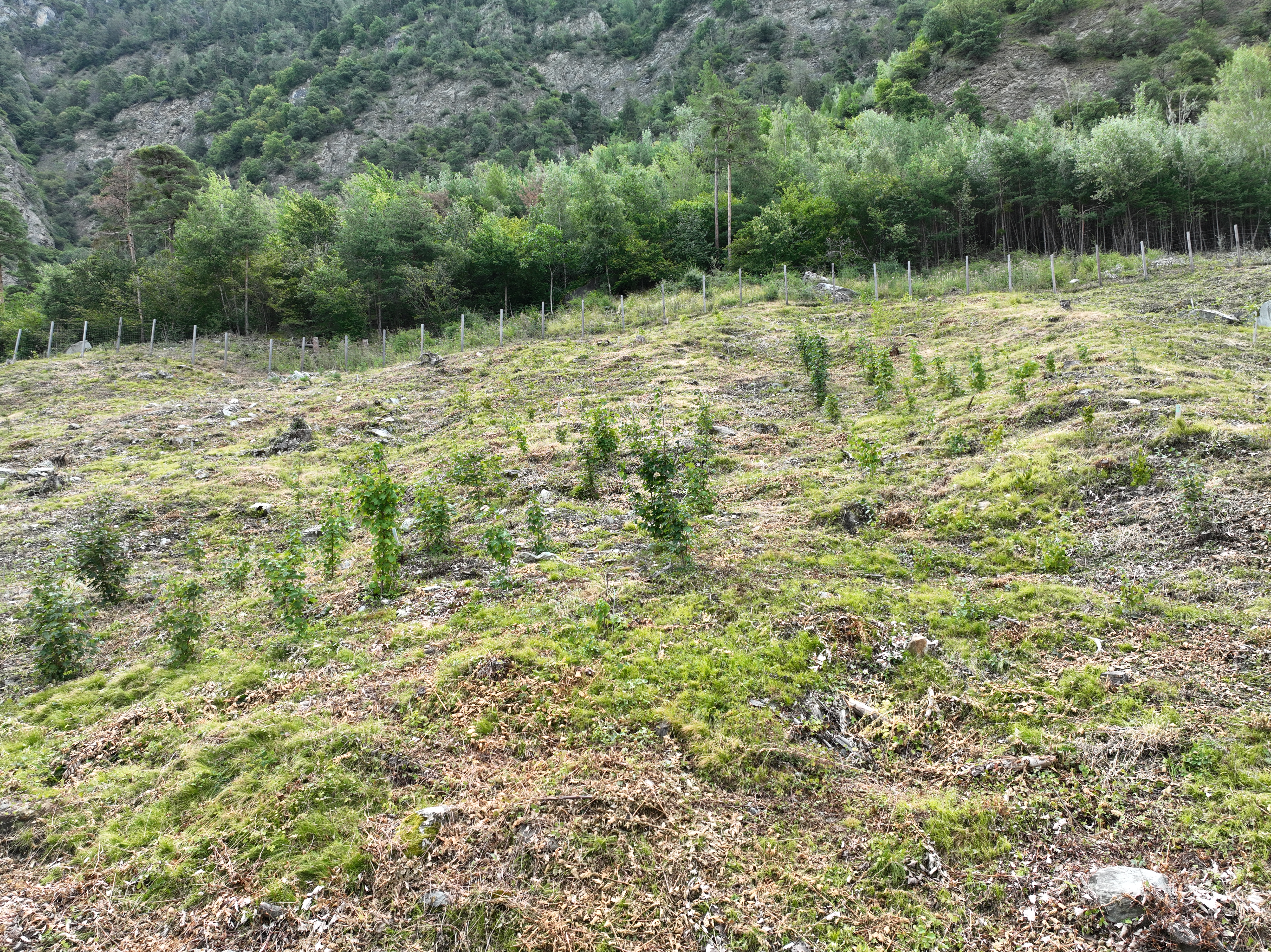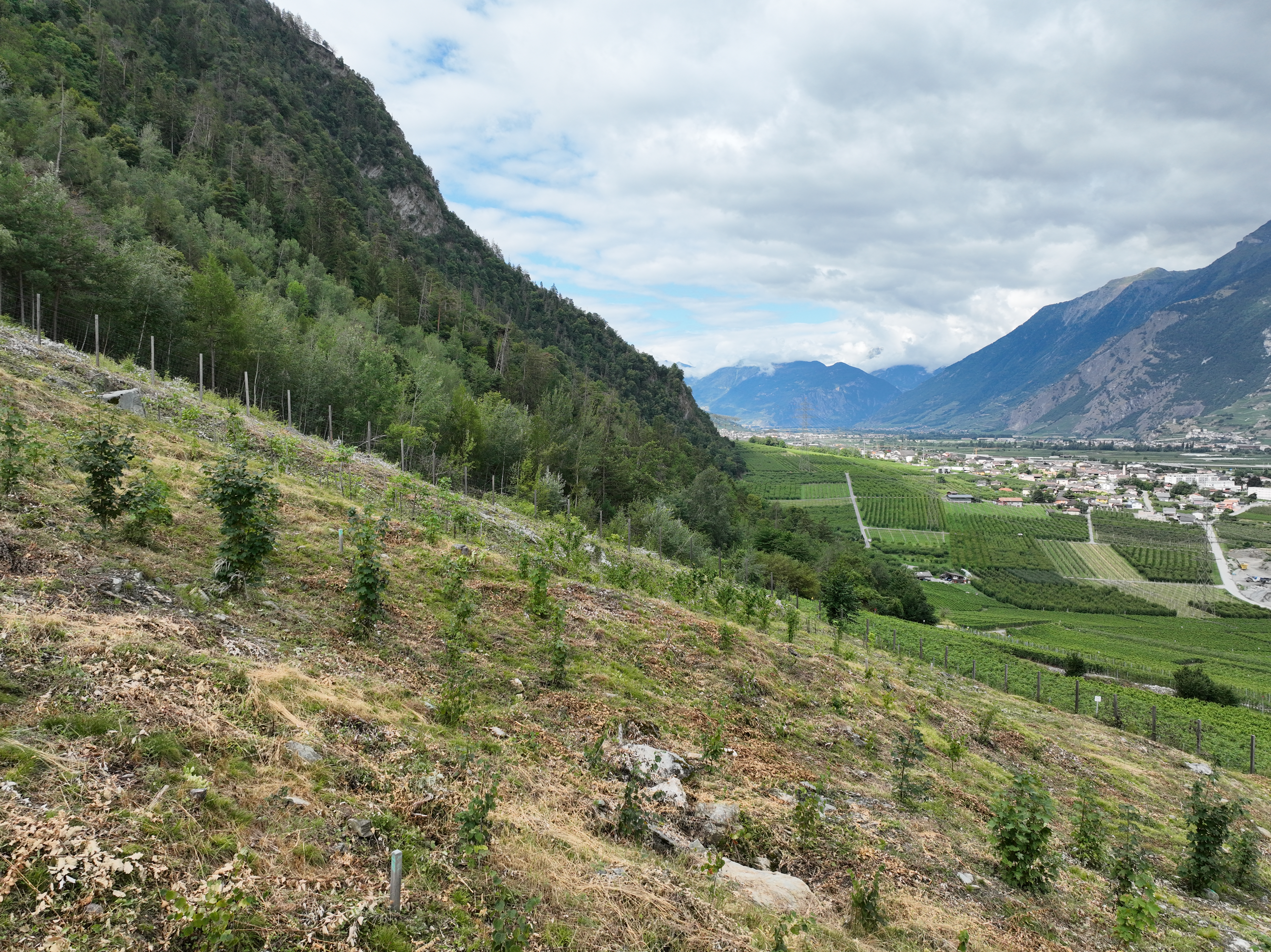 À l'automne 2025, un inventaire a été réalisé sur toutes les placettes de plantation expérimentales. Jusqu'à présent, la mortalité a été évaluée trois fois sur toutes les placettes (en 2023, 2024 et 2025) et la hauteur de toutes les plantes a été mesurée une fois (en 2024 ou 2025). La plupart des plantes ont bien poussé. Les résultats de l'inventaire peuvent être consultés dans la dernière colonne du tableau « Etat (# d'arbres par provenance) » du chapitre « Placettes ». Les provenances d'arbres qui ont mal poussé sur une placette sont regarnies jusqu'à deux ans après la mise en place de la plantation. Les travaux de regarnissage seront terminés au printemps 2025. Les mesures actuelles des stations climatiques peuvent être consultées sur notre portail Grafana.