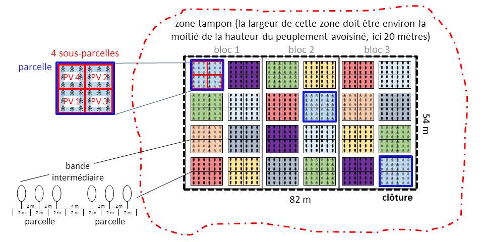 La superficie requise pour chaque plantation expérimentale dépend du nombre d’essences à tester et de la hauteur du peuplement avoisinant qui influe sur la largeur de la zone tampon nécessaire. Les plants sont espacés de 2 m, la largeur de la bande intermédiaire entre les parcelles est de 4 m. La superficie requise est d'environ 0,75 ha pour 4 essences et d'environ 1,3 ha pour 10 essences.