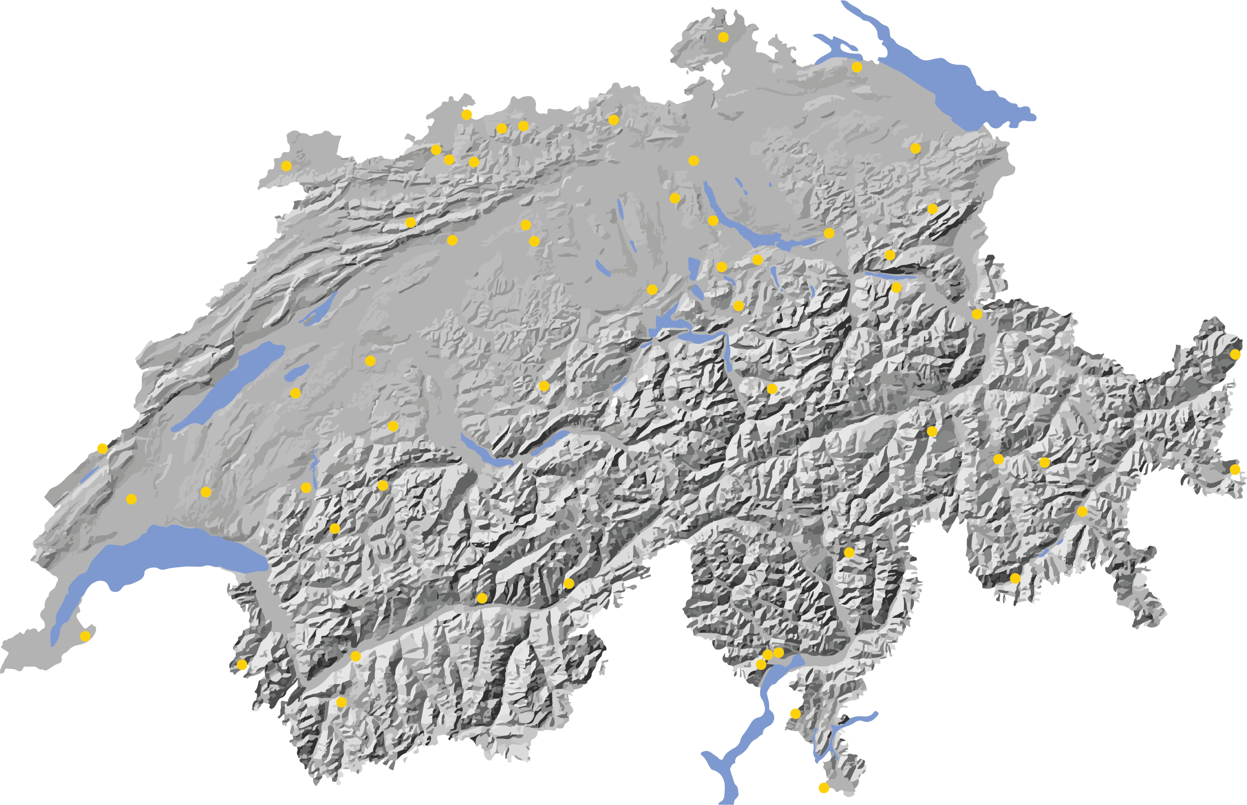 C’est pour répondre à cette question que le projet « Plantations expérimentales d'essences d'avenir » a été initié. Dans le cadre de celui-ci, un réseau de plantations expérimentales coordonnées se met en place dans toute la Suisse depuis l’automne 2020 (figure de droite). Sur une période de 30 à 50 ans, 55000 plants seront examinés pour étudier la façon dont différentes essences et semences de diverses origines perdurent dans des conditions environnementales variées. Ces observations serviront de bases à la recommandation d’essences en fonction des conditions locales des stations. Du point de vue scientifique, il est intéressant de connaître les facteurs environnementaux qui définissent la survie, la vitalité et la croissance des essences examinées et de leurs provenances (synonyme: origines) le long des grands gradients environnementaux.