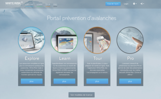 EXPLORE est un ouvrage nivologique interactif de référence complet. Le module LEARN propose des leçons en ligne avec objectifs et tests. Avec l’outil de préparation TOUR, il est possible de préparer entièrement des sorties et de les lier avec l’appli du même nom. Pour ceci, vous disposez de cartes Swisstopo avec différentes couches, ainsi que des cartes topographiques françaises et autrichiennes. Le module PRO permet d’élaborer des présentations avec des contenus White Risk.