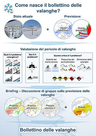 Per creare un bollettino delle valanghe non basta premere un bottone, ma è necessario un complesso lavoro di gruppo. Ogni giorno, tre delle nove persone responsabili delle previsioni si alternano al servizio di previsione valanghe. Per redigere un bollettino affidabile devono analizzare e interpretare una “valanga” di dati e informazioni. Per questo lavoro sono richieste conoscenze specialistiche ed esperienza.