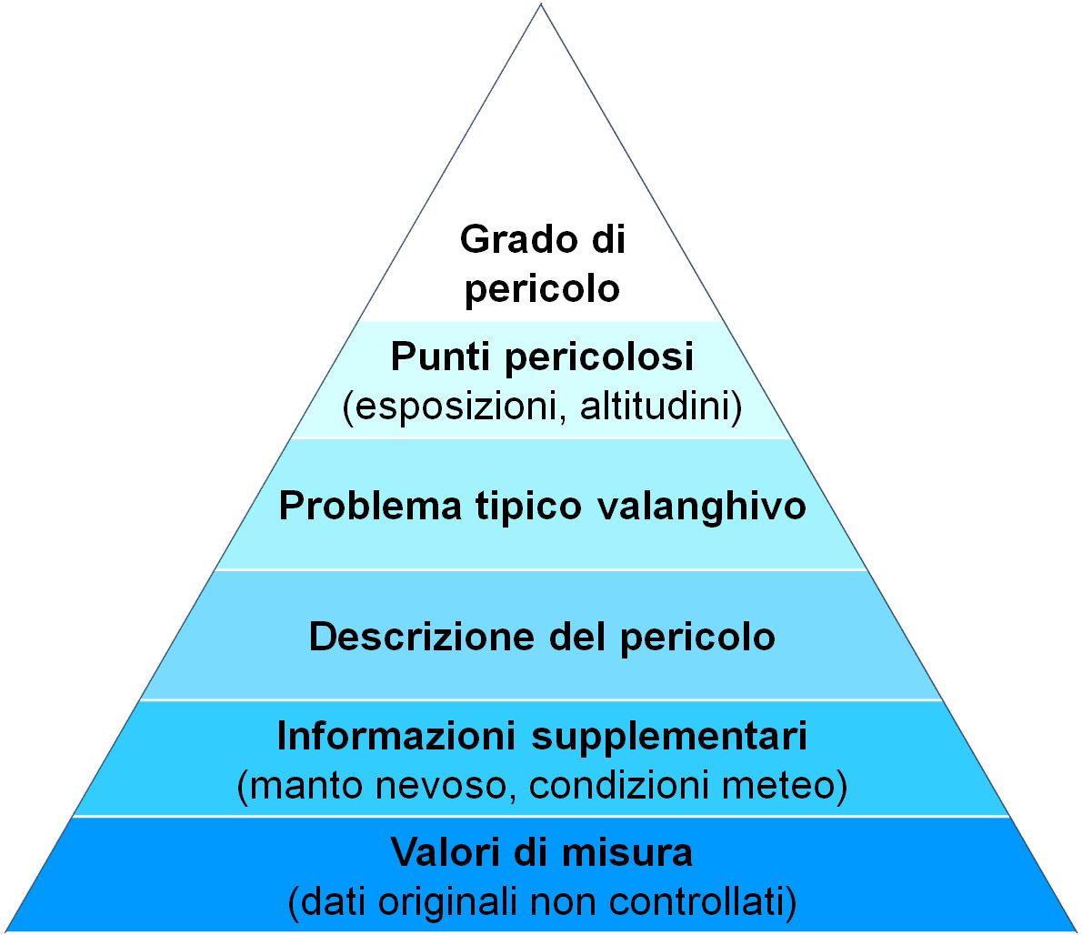 In alta stagione il bollettino delle valanghe è strutturato secondo la “piramide dell’informazione”, cioè prima le informazioni più importanti (gradi di pericolo), poi le informazioni sulle parti di terreno dove si applica il grado di pericolo e successivamente il problema valanghivo, la descrizione del pericolo così come informazioni sul manto nevoso e le condizioni meteo. Infine, è anche possibile accedere ai dati rilevati dalle stazioni di misura. Una terminologia unificata semplifica la comprensione e la messa in pratica.
