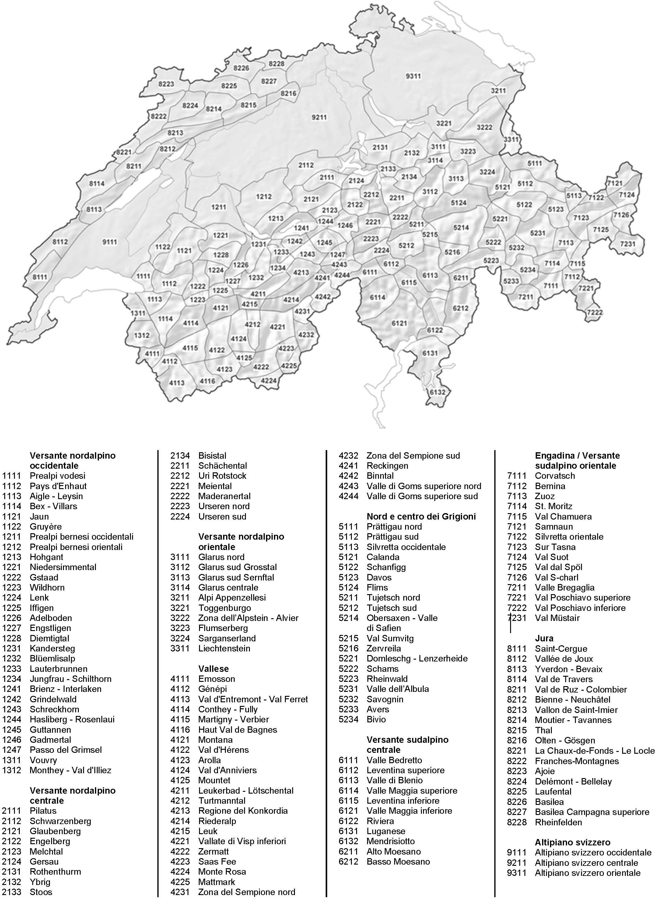 Fungono da base per la suddivisione geografica le zone di avviso utilizzate anche dagli altri servizi specializzati in pericoli naturali della Confederazione (MeteoSvizzera, Ufficio federale dell'ambiente UFAM, Servizio sismico svizzero SED). Per il raggruppamento di più regioni, dettato per lo più da criteri climatologici o politici, vengono utilizzate espressioni regionali di ordine più generale (v. le carte in basso).