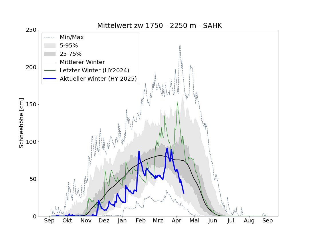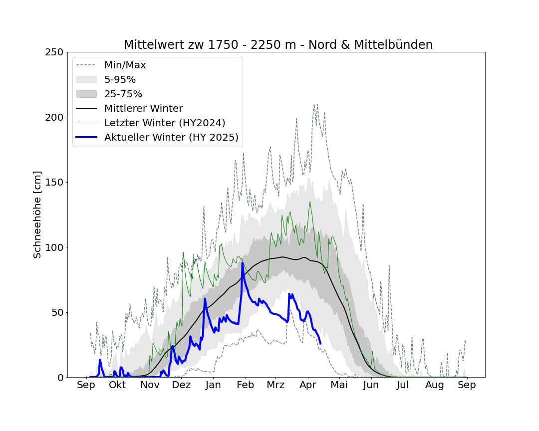 A metà aprile 2025, il minor deficit di neve è stato osservato a sud della cresta principale delle Alpi, dove era presente il 42 % della media degli anni dal 1991 al 2020. A livello nazionale, la quantità di neve a 2000 m a metà aprile 2025 era pari al 36 % dei valori consueti.