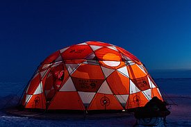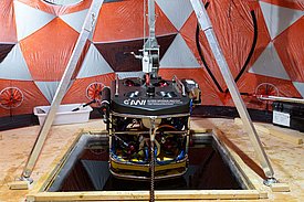 Durante le misure con la «bestia» è solo il «cacciaorsi» a soffrire. Infatti le altre tre persone si trovano all’interno di una tenda riscaldata sopra al buco nel ghiaccio. Prima di tutto è necessario sottoporre il robot a un test funzionale completo. Quando è tutto in ordine, si immerge il pesante strumento in acqua con l’aiuto di un paranco e si srotolano circa 700 m di cavo in modo che il pilota sia in grado di percorrere i tragitti prestabiliti e rilevare la topografia di ciò che si cela sotto al ghiaccio. Durante queste due ore di attesa si può sognare di affondare i denti in una cicoria belga immaginaria, di figurarsi il sapore della rucola fresca o semplicemente spaventarsi per una foca che spunta improvvisamente dal buco nel ghiaccio (d’accordo, anche la foca si spaventa!).