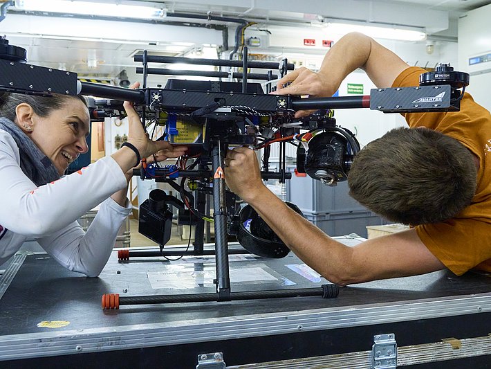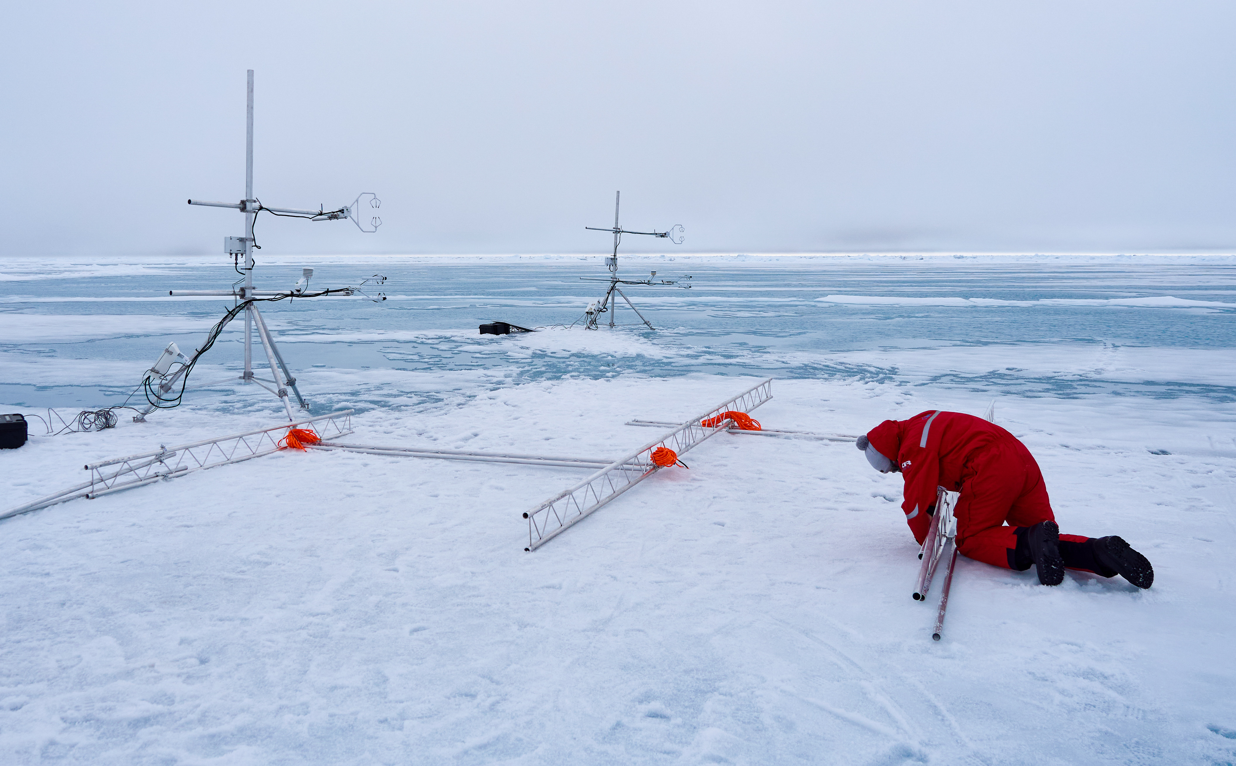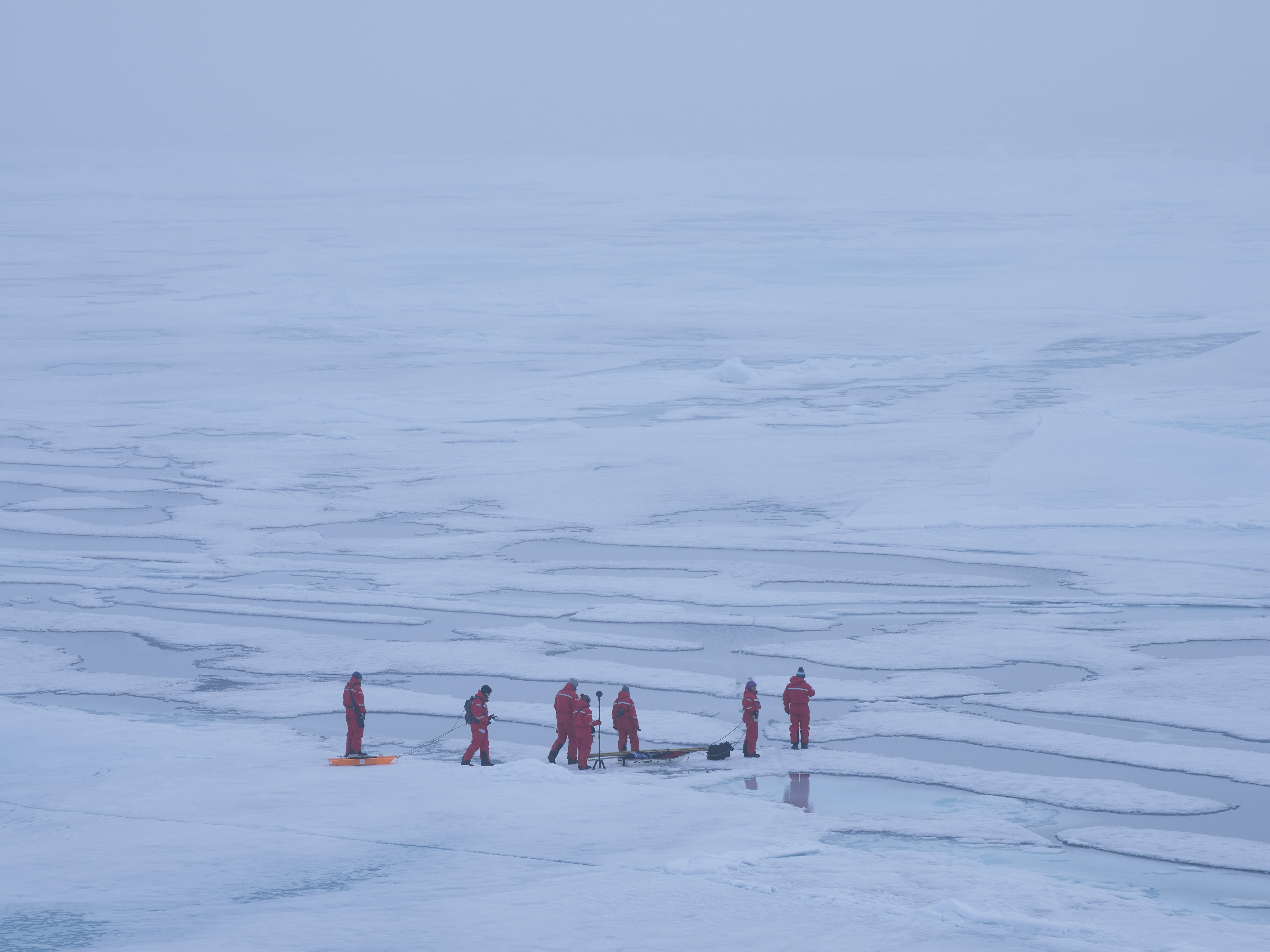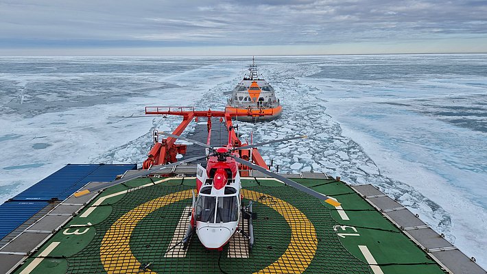 Sulla nave è impressionante vedere come i banchi di ghiaccio, a volte spessi diversi metri, si rompano sotto il peso dello scafo e vengano spinti da un lato. Quando il tempo lo permette - e questo non è così comune nell'Artico, che in estate è spesso nebbioso - l'equipaggio effettua voli di ricognizione con l'elicottero di bordo per trovare il percorso migliore attraverso il ghiaccio. I ghiacci spessi sono spesso interrotti da canali con acque libere e talvolta da passaggi chilometrici senza ghiaccio. Sono disponibili anche immagini satellitari giornaliere che forniscono informazioni sulla distribuzione del ghiaccio e sulle possibili rotte. È difficile prevedere il nostro arrivo alla prima posizione di misurazione: se il ghiaccio è troppo spesso, la nave deve spesso fare marcia indietro per guadagnare slancio, che a volte è sufficiente solo per pochi metri.