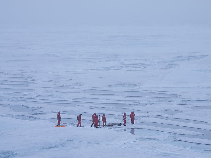 Dopo due giorni di rompighiaccio, è arrivato il momento. Al mattino, i primi ricercatori escono sul ghiaccio ed esplorano la banchisa. Quanto è spesso il ghiaccio? Dove ha senso effettuare le misurazioni? I circa 50 ricercatori a bordo hanno molti interessi diversi ed è importante soddisfarne il maggior numero possibile. Solo così è possibile creare un set di dati completo. Per le nostre misurazioni della turbolenza atmosferica, è importante che ci troviamo in un punto di transizione tra stagno di fusione e ghiaccio e che il vento trasporti l'aria dallo stagno di fusione al ghiaccio. Cerchiamo di effettuare le misurazioni della superficie e della neve nel maggior numero possibile di punti per catturare al meglio l'eterogeneità spaziale dello strato di diffusione superficiale (SSL), che diffonde la luce incidente e quindi determina l'aspetto chiaro o scuro del ghiaccio e la quantità di luce che riflette (importante per la fusione) o la quantità di luce che trasmette (importante per l'ecosistema marino e ilciclo della CO2). Inoltre, i sentieri devono essere segnati in modo che ogni Gruppo di ricerca possa lavorare sul ghiaccio intatto.