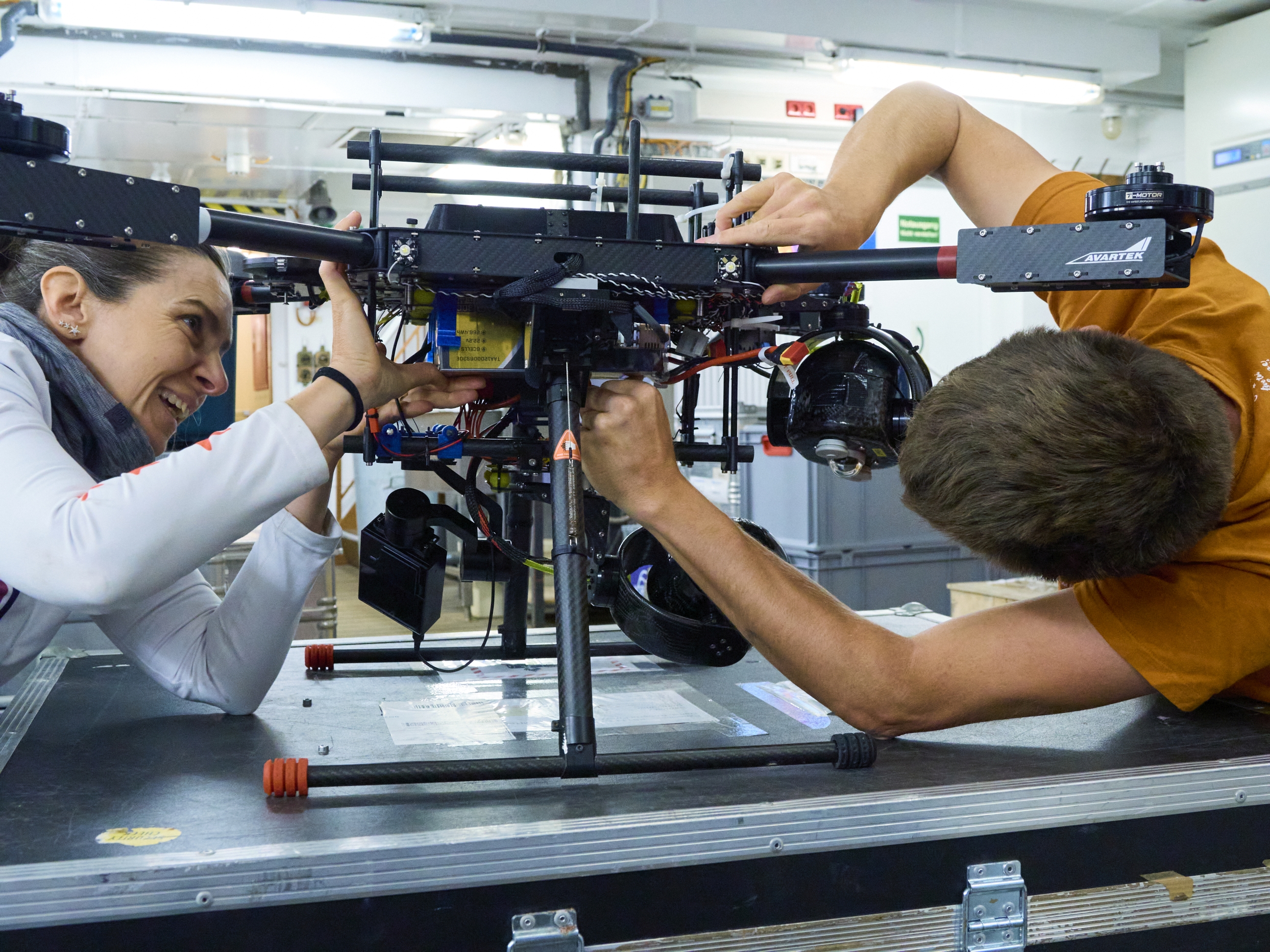 Come previsto, incontriamo la Stazione Polare Tara proprio sul bordo del ghiaccio. La nave francese, di recente costruzione, ricorda un UFO o una stazione spaziale. Il piano è quello di congelare ripetutamente nel ghiaccio marino artico nei prossimi 20 anni e poi andare alla deriva con il ghiaccio per oltre un anno mentre conduce esperimenti. Poiché la nave non è costruita per rompere il ghiaccio, ma per andare alla deriva, ci accompagnerà per diverse miglia nel ghiaccio. Viaggia direttamente dietro la Polarstern e sfrutta così il canale libero per avanzare meglio. Il giorno successivo ci lasciamo alle spalle la Stazione Polare Tara e proseguiamo il nostro viaggio verso nord.