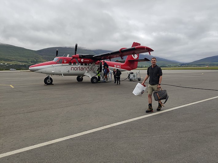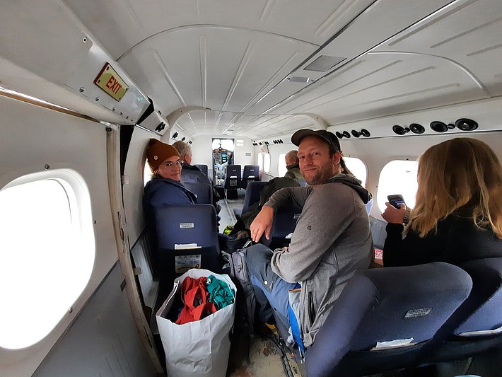 Come si fa a raggiungere questo luogo remoto della Groenlandia dove decenni fa lavoravano dei botanici? Le singole tappe significano diminuzione del comfort e aumento dell'avventura. Prima si viaggia in aereo da Zurigo a Reykjavik, in Islanda (dove lo zaino di Andreas non arriva, quindi dobbiamo comprargli tutto l'equipaggiamento in loco), poi con un volo interno più piccolo fino ad Akureyri. Poi a Constable Point, un piccolo hub aereo nella Groenlandia orientale. Poi l'ultimo volo in un piccolo Twin Otter fino alla stazione di ricerca di Zackenberg. Infine, una mezza giornata di navigazione in Zodiac, per raggiungere finalmente la nostra destinazione: Eskimonæs, all'estremità meridionale di Clavering Ø.